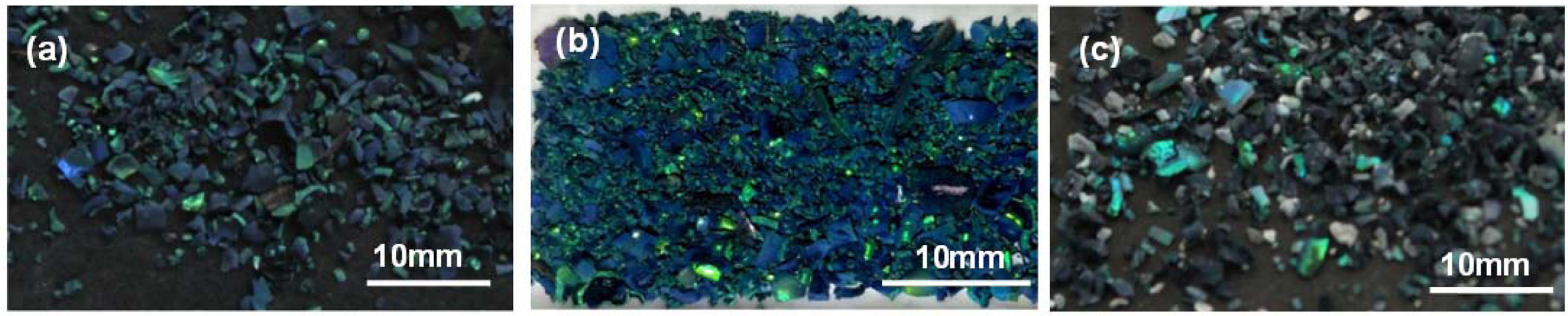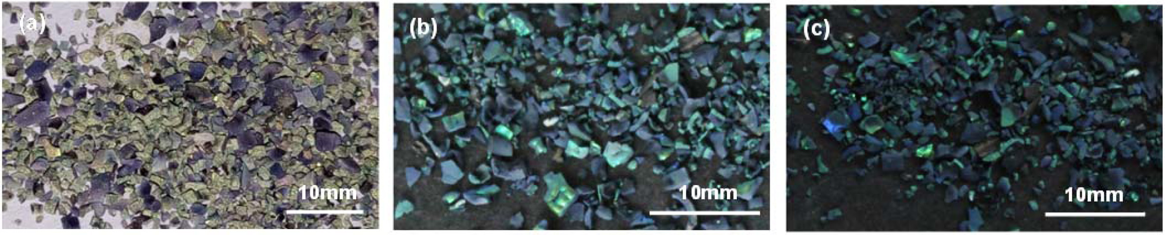 Fig. 5 The color saturation of the inverse opal zirconia sintered at various temperatures with 0.8 L/min nitrogen rate (a) 450 oC; (b) 600 oC; (c) 700 oC. |