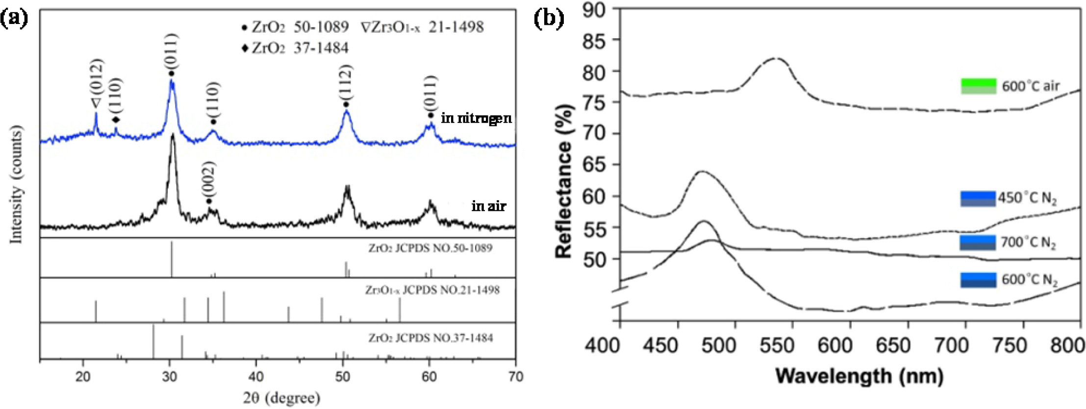 The reflection spectrum of the samples was shown in Fig. 6(b). All the samples displayed a single band gap in the visible region. The diffraction peaks of the samples sintered at 600 oC with various sintering atmospheres shifted from green range to blue range in the spectrum for which the formation of carbon on the pore wall of zirconia in the nitrogen atmosphere would reduce the refractive index of zirconia and lead to the shift of the forbidden band position. Since the organic matter carbonized in this process, the in-situ carbon absorbed some stray light produced by the difference of pore size and structural defects in other bands in the sample, which made the bandgap width narrow and affected the position and intensity of the bandgap. Therefore, the color saturation of the inverse opal zirconia could be controlled by adjusting the content of in-situ carbon produced in it.