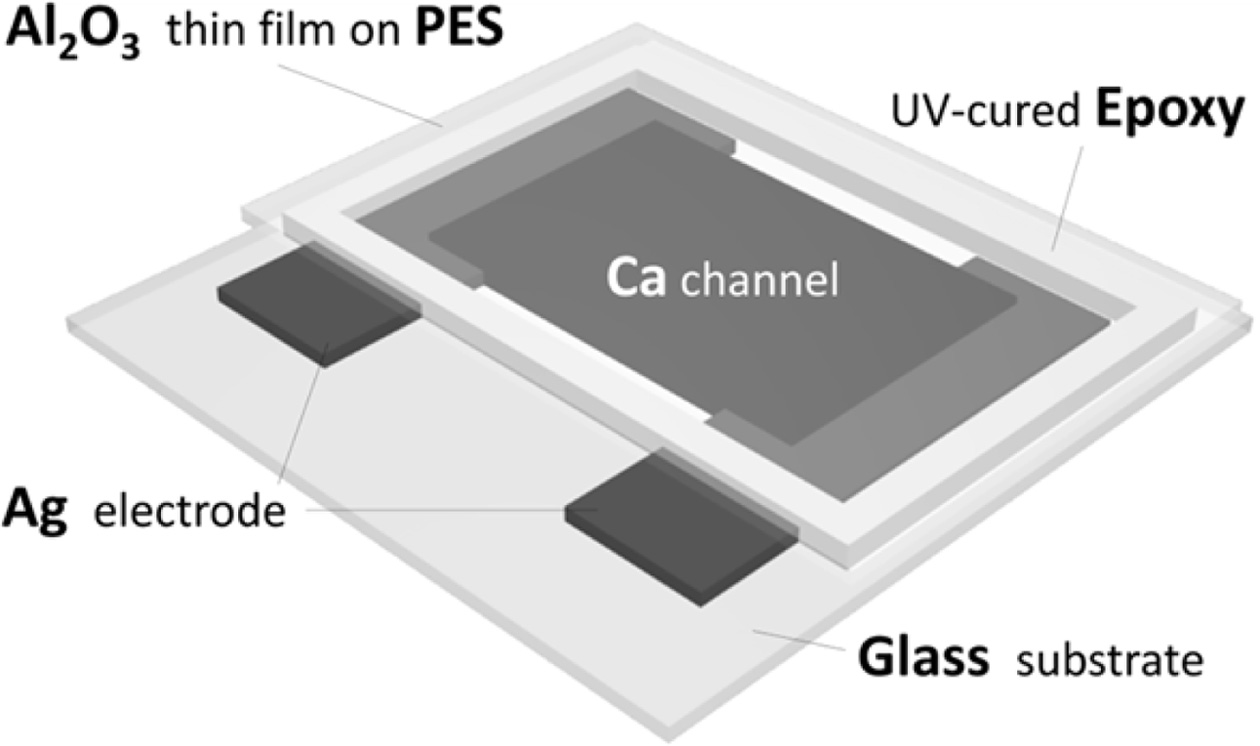Compared to other methods, thin film encapsulation (TFE) is a promising technique because it offers more flexible, lighter and thinner characteristics [3]. Commonly, it is performed using various low temperature deposition processes such as sputtering, plasma enhanced chemical vapor deposition (PECVD), and atomic layer deposition (ALD) [7-9]. Among various TFE methods, thin films prepared by ALD have been shown to provide superior protection against the permeation of moisture and oxygen [2]. This technique has numerous of advantages such as excellent uniformity, precise thickness control, and strong adhesion [10-12]. Above all, it can produce nearly defect-free thin films; thus, its thin films have been proposed as an ideal moisture barrier layer for passivating flexible electronics [13-16]. There are some examples in previous studies where the permeability of ALD thin films improved by orders of magnitude when a critical thickness was reached [10, 17, 18]. For aluminum oxide (Al2O3) processed by ALD [19, 20], critical thicknesses between 5 and 25 nm were found. It is obvious that the significant improvement in moisture barrier performance is strongly related to the thickness of ALD thin films. Furthermore, a critical thickness may be a key determinant in developing multi-layers of inorganic barrier layers and polymer-like interlayers.