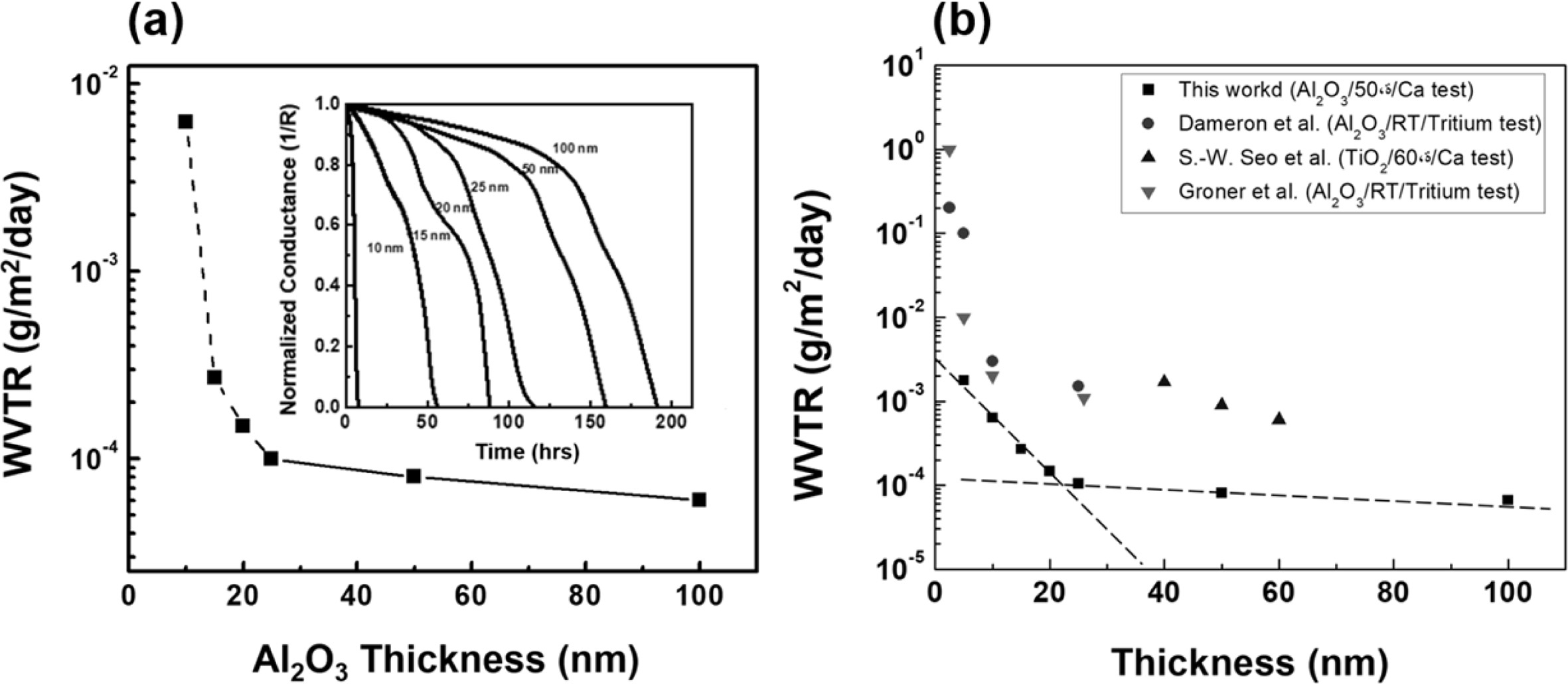 We measured the WVTR values to investigate the effect of Al2O3 thickness on moisture barrier properties. The WVTR measurement of Al2O3 samples with thicknesses of 10, 15, 20, 25, 50, and 100 nm were carried out by the electrical Ca test. Conductance changes of the Ca layer encapsulated with Al2O3 thin films as a function of water exposure time under accelerated condition (50 oC, 50% RH) are shown in the inset of Fig. 2. The slope of the conductance curve was used to calculate WVTR values according to the following equation: