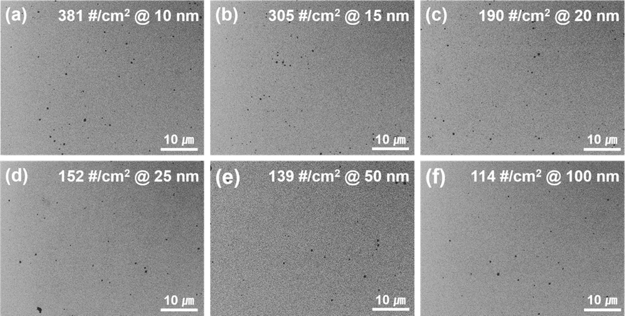 Fig. 3 FESEM top view images of defects in Al2O3 thin film with thickness of (a) 10 nm, (b) 15 nm, (c) 20nm, (d) 25 nm, (e) 50 nm, and (f) 100 nm, respectively. |