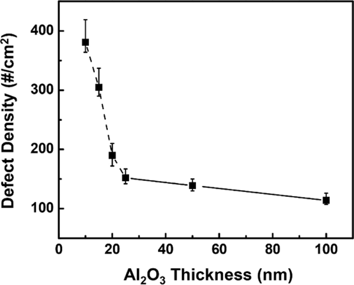 The above-mentioned results are summarized in Table 1. These results indicated the existence of critical thickness, at which the change from an exponential to a sub-exponential permeation regime was observed. The dependence of moisture barrier performance and Al2O3 thickness had a similar tendency with the defect density and refractive index. In Al2O3 thickness below 25 nm, the significant improvement of moisture barrier properties resulted from rapid decrease in defect sites, which related to the increase in refractive index. In contrast, the gradual decrease in WVTR value of samples with the thickness above 25 nm had relevance to little change in the defect density and refractive index. That’s to say, we interpret the improvement of moisture permeation performance as the formation of continuous thin films by a reduction of defect sites with the increase of Al2O3 thickness. Hence, for the production of an appropriate moisture permeation barrier with Al2O3, the number of ALD cycles is important to reduce the defect sites and increase the refractive index.