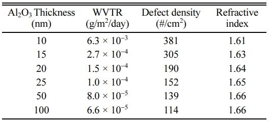 Table 1 WVTR, refractive index and defect density comparison of Al2O3 thin films with thicknesses of 10, 15, 20, 25, 50 and 100 nm |