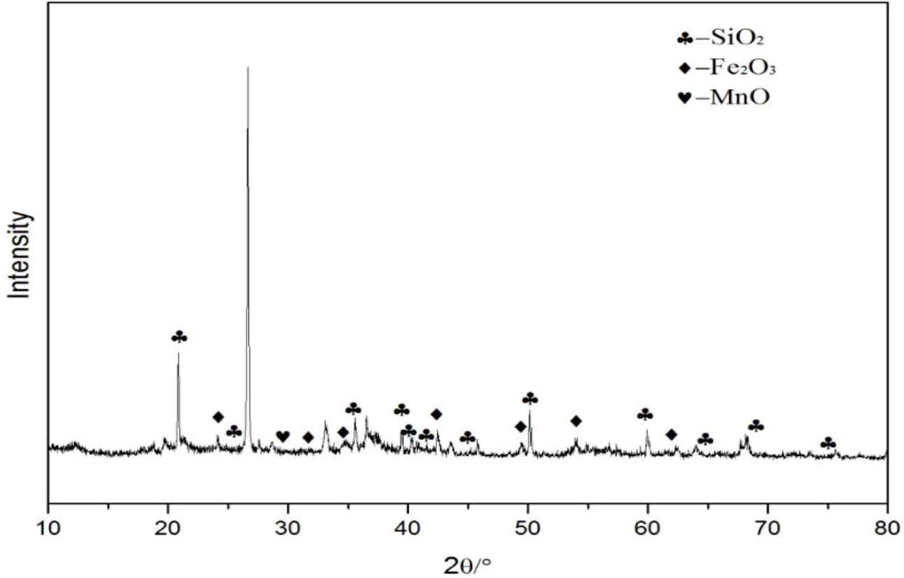 Manganese tailings were collected in this study (Fig. 1). Fig. 2 shows the XRD pattern of the manganese tailings, which are composed of silica, manganese oxide, and ferric oxide. The raw materials used in this experiment are shown in Fig. 2. The main raw material used in the experiment was manganese tailings, and calcium oxide and kaolin were used as sintering aid and binder, respectively. The materials were mixed at a certain ratio, ball milled, and foamed. The slurry was poured into a mold and dried to obtain the blank permeable brick. Atmospheric sintering was carried out using the SX-G12133 high-temperature furnace to study the effect of sintering on the performance of permeable bricks, and the sintered permeable brick samples were obtained and stored for future use. The density of the sintered sample was determined using the AR2140 electronic balance, and the porosity of the sample was determined through the relationship with the theoretical density. According to the standard of permeable pavement bricks and permeable road panels (GB/T25993-2010), the water permeability coefficient of the sample can be measured using the stable water pressure method. The phase separation and microsctructure of the sample were determined using the D8 Advance X-ray diffractometer and the SU8010 scanning electron microscope (SEM), respectively. table 1