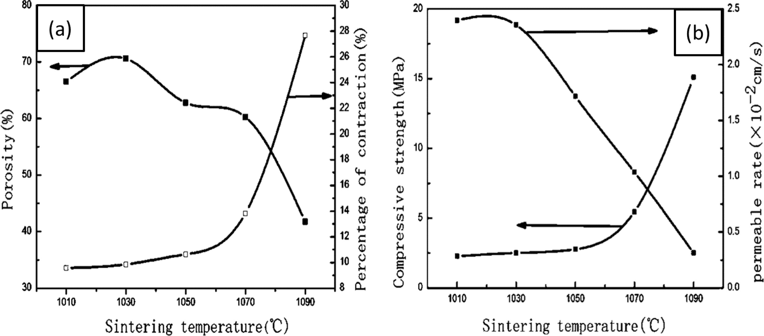 Fig. 4 shows the performance evaluation results of samples prepared at different sintering temperatures at a heating rate of 4 oC/min and holding time of 2 h. Fig. 4(a) shows that increasing temperature results in gradually decreasing porosity and gradually increasing shrinkage. The porosity of the sample sintered at 1,030 oC is the best, and the porosity decreases linearly after 1,070 oC. Fig. 4(b) shows that increasing temperature results in gradually decreasing water permeability and gradually increasing compressive strength.