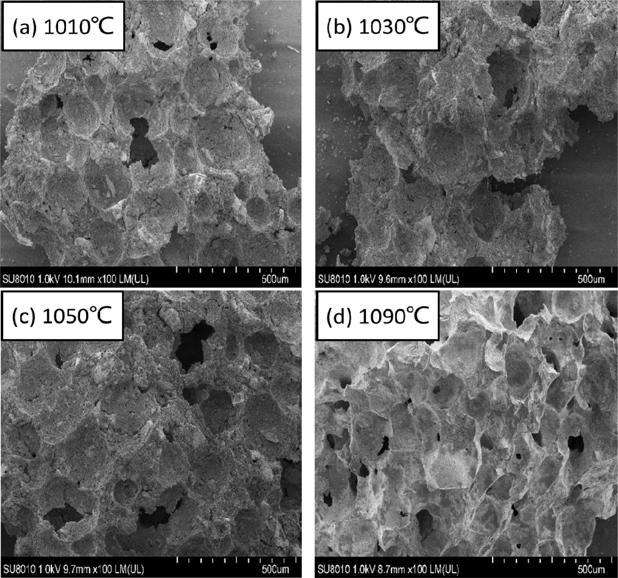 Figs. 5(a-c) show that at sintering temperatures of 1,010 oC, 1,030 oC, and 1,050 oC, the size of the pores on the surface is similar, and some small holes and cracks are observed on the pore wall. The rate is relatively high. Water can pass through the holes, and the water permeability is relatively high. Fig. 5(d) shows the SEM image of the sample prepared at a sintering temperature of 1,090 oC, which have smaller pores, glowing pore wall, and fewer pores compared with the samples sintered at the previous temperatures. The sample has a clear liquid phase, smooth pore walls, and dense pore structure. Thus, low porosity and low water permeability are observed, and some pores are closed by the liquid phase [17-18]. At low temperature, the skeleton of the sample (Fig. 5c) shows porosity and density. However, as the temperature increases, the grains continue to grow, and increasing liquid phase and decreasing pore structure are observed. Fig. 5(d) shows many grains on the surface, and an evident glass phase and a dense structure are observed. The compressive strength of the pore structure continues to increase as the temperature rises but is basically unchanged at 1,010 oC–1,050 oC. At temperatures above 1,050 oC, the compressive strength increases rapidly, and the water permeability decreases continuously. As such, the optimal sintering temperature is 1,030 oC.