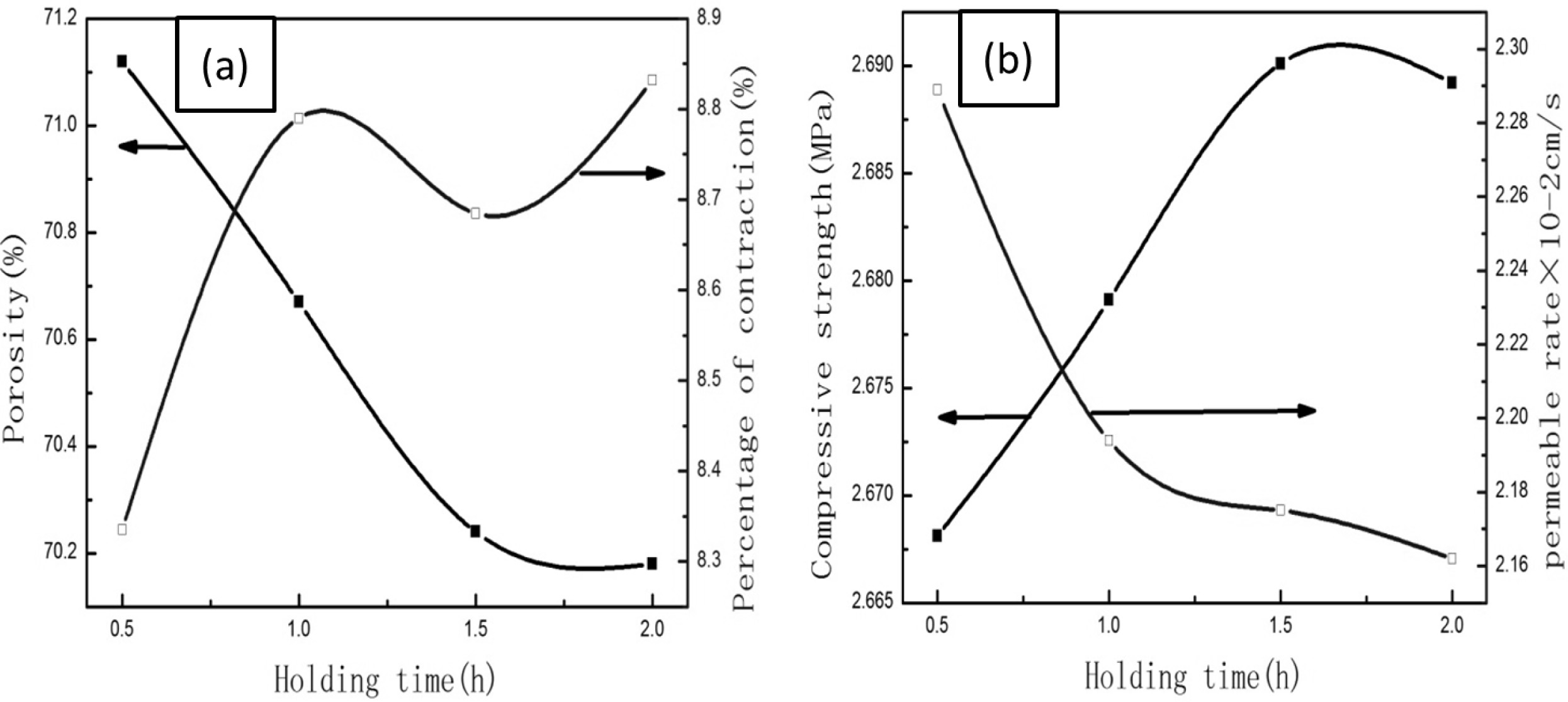 Fig. 7(a) shows that increasing holding time results in gradually decreasing porosity. However, the porosity is about 70%, and the difference is about 1%. The shrinkage rate is almost the same at 8%–9%. Fig. 7(a) also shows that the porosity at holding times of 0.5 and 2 h is similar, which may be caused by the insufficient setting of the holding time. If the holding time is long enough, the green body may change drastically during the sintering process. A new phase may be generated, and the performance may change significantly. If sufficient heat is not provided, the grains cannot grow sufficiently, and the microstructure and the pore structure remain unchanged. Fig. 7(b) shows that as the holding time increases, the water permeability gradually decreases, but the difference is not large. Moreover, the compressive strength gradually increases. At holding time of 1.5 h, the compressive strength almost stabilizes. The compressive strength at holding times of 0.5 and 2 h is not different. Fig. 8 shows that the pore structure at holding times of 0.5 and 2 h has about the same size and sparse structure. Considering the performance requirements of permeable bricks and the factors of energy consumption, the optimal holding time is 1 h.