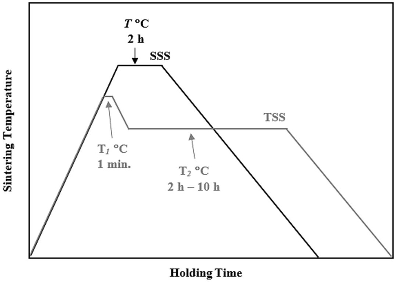 Sintering is an important process in the fabrication of tetragonal zirconia artefacts through the application of heat at a temperature below the melting point of the ceramics. During this process, densification takes place as a result of the reduction in the surface area of the co-joining particles. The objective is to facilitate particles consolidation through a complex diffusion and mass transfer mechanisms which occur concurrently at the surface, bulk and grain boundaries [34]. However, in order to achieve high densities, typical conventional SSS approach often requires the use of high sintering temperatures and long holding times which often resulted in accelerated grain growth which occurs in the final stage of sintering [35]. In addition, the formation of some cubic phase is inevitable when sintered at high temperatures and this has an adverse effect on the durability of the sintered body [19, 36]. This has posed a challenge and many researchers have examined the effects of two-step sintering (TSS) as an alternative low-cost sintering method. Chen and Wang [37] were amongst the pioneer to demonstrate the viability of TSS in promoting densification via grain boundary diffusion in yttrium oxide and restraining grain boundary migration thus avoiding grain coarsening.