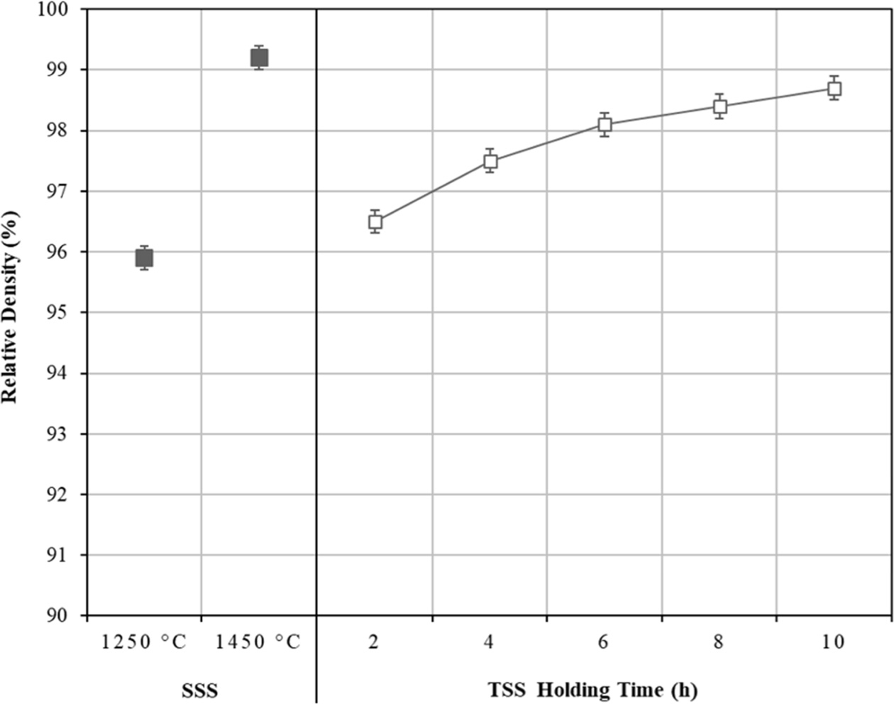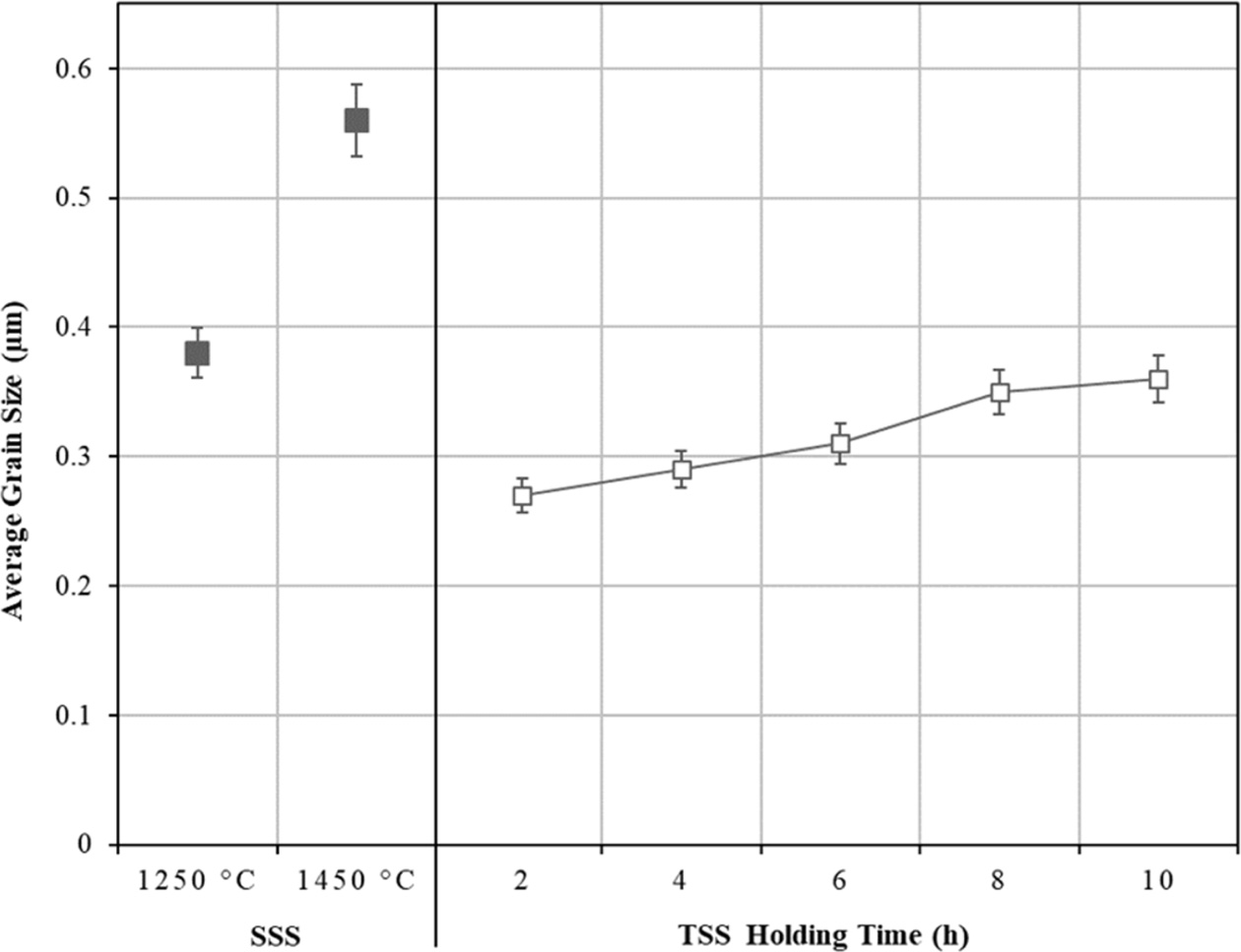 In another study, Suárez et al. [57] observed a similar microstructural development in their Y-TZP with TSS exhibiting finer tetragonal grain size. Mazaheri et al. [58] reported that there exists an incubation period for grain growth during TSS. They observed significant grain growth when the holding time exceeded 20 h. A fully dense structure would only be possible with appreciable grain growth, although the final grain size may still be smaller than that of SSS [59].