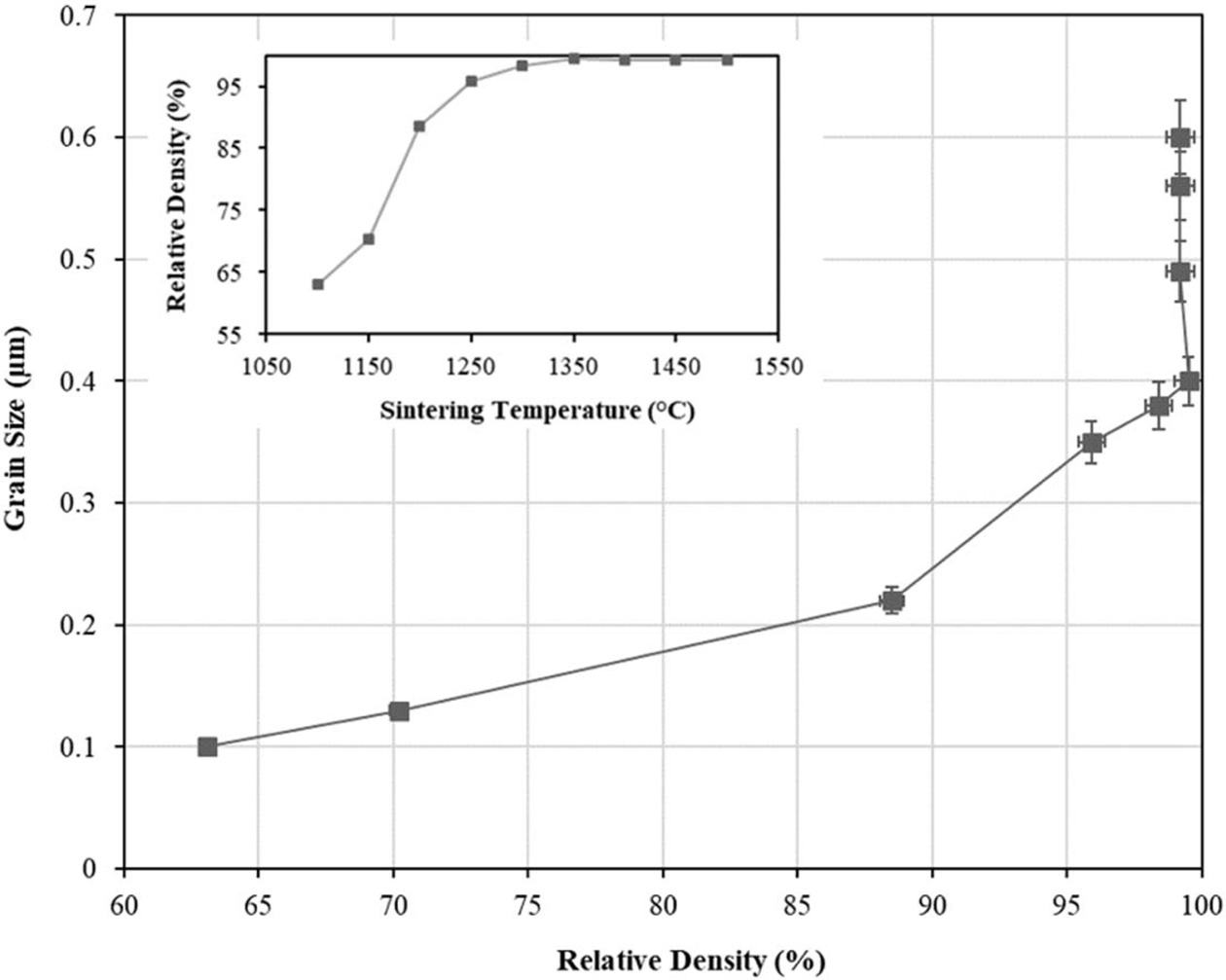 Fig. 4 The tetragonal grain size as a function of relative density of samples subjected to conventional single-step sintering from 1100 oC to 1500 oC. The inset shows the variation in relative density with sintering temperature. |