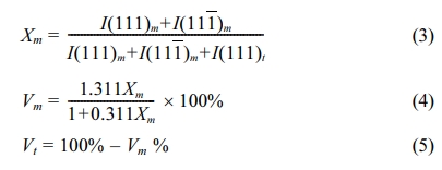 where Xm is the integrated intensity ratio, I(111)m and I(111)t are the peak intensity of the monoclinic and tetragonal phase, respectively, Vm and Vt are the calculated volume fraction of the monoclinic and tetragonal phase, respectively.