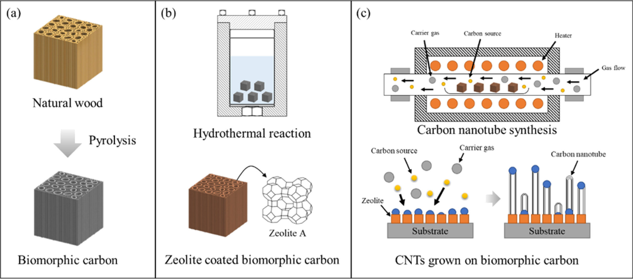 Carbon nanotubes (CNTs) were synthesized by catalytic chemical vapor deposition of acetylene over metal ion-loaded LTA (linde Type A)template coated biomorphic carbon materials (BCMs). BCMs with 20- to 35-μm pore dimension were prepared by Cypress carbonization process in Ar atmosphere; thereafter, LTA crystals were synthesized and homogeneously coated on BCMs by an in situ hydrothermal process. We focused on the Co, Fe, Ni, and Cu nanoparticles, varying the catalyst nanoparticles for obtaining better CNTs yield and evaluated the crystallinity of CNTs. Multi-walled carbon nanotubes (MWCNTs) with an inner diameter of 9.54 nm, an outer diameter of 34.71 nm, and the yield of 15.50% were synthesized at 650 oC for 120 min with Co nanoparticles, and the ID/IG of 0.99 of CNTs was obtained