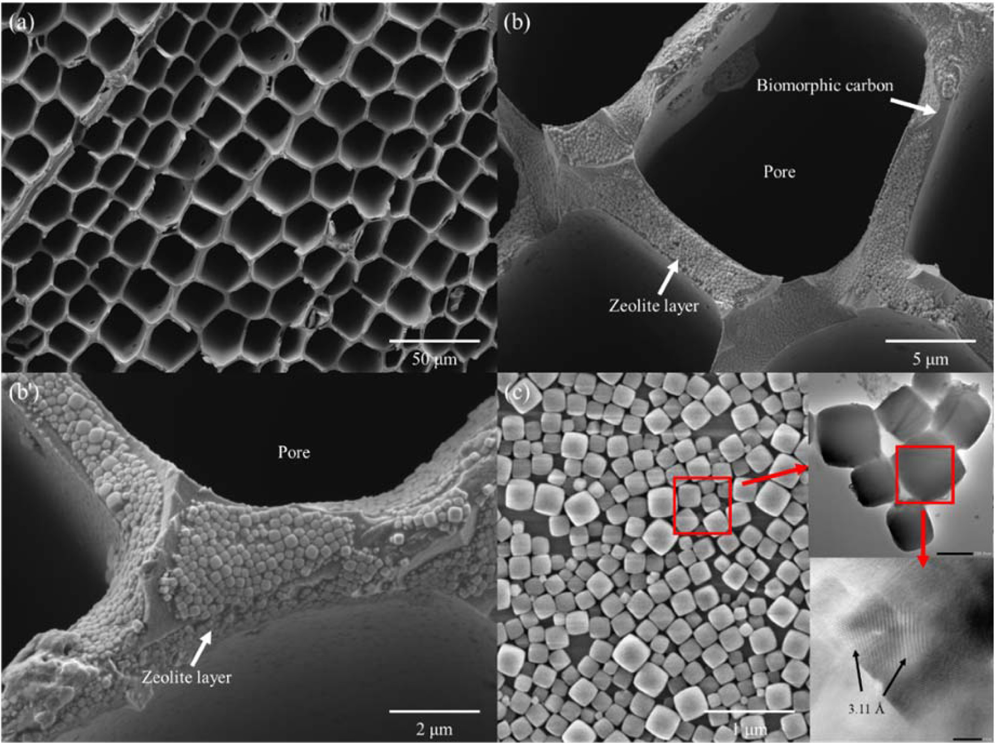Figs. 2(a) show a hexagonal cell structure of BCMs, which has a pore size in the range 18.6 to 38.3 μm, and each cell-wall thickness is about 2.30 ~ 1.40 μm. Most of the cellular pores are rectangular, and the distribution shows a regular net with carbon walls joined to each other. The compressive strengths of Hinoki with a pore size of 19.60 μm, and a wall thickness of 2.3 μm are 52.65 MPa. The LTA template are uniformly coated inside and outside of the honeycomb structure as shown in Fig. 2(b) and (b'). A single phase of LTA template reflected in 2θ = 7o (200), 10o (220), 13o (222), 22o (531), and 24o (600) was found in the obtained XRD analysis with compared to JCPDS file # 97-002-4901. This is a well-developed cubic arrangement of eight tetrahedra with D4R [13]. All the FESEM and TEM (insert) shown in Fig. 2(c) reflect both a high crystallinity and uniform size distribution of LTA crystals.