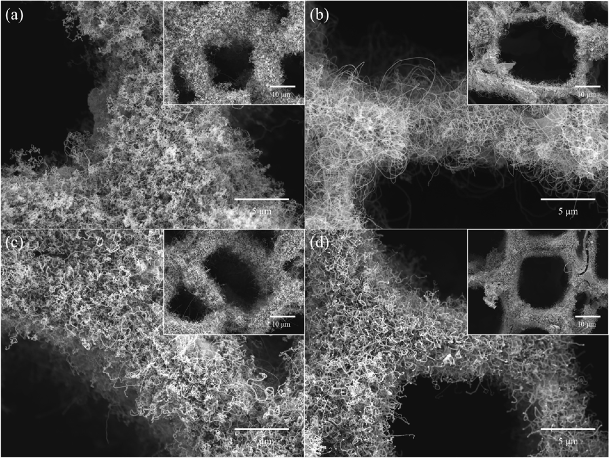 Due to recent morphological, physical and chemical properties, studies of CNT composites have been reported in nanomedicine, energy storage, and filtration [1, 2]. CNTs have strong van der Waals force with high surface area and large aspect ratio, which has a great influence on filtration performance [3]. In addition, their physical properties can adsorb contaminants, including bacteria and viruses, and heavy metals from condensation and pore spaces [4, 5]. The high-density CNTs network, forming pore sizes ranging from nano-pores to intermediate pores supported on ceramic, biomorphic, or other substrates, can be used to effectively remove contaminants from air or aqueous physical adsorbents to create gas adsorption, filtration, and purification systems [6, 7]. However, in order to develop such new CNTs-containing composites, a porous carrier having good air permeability must be developed. In particular, it requires a low-cost and very difficult process of the complex, such as the growth and distribution of CNTs uniformly and non-agglomerated in the substrate as well as the quantity and quality of CNTs grown on the substrate [8, 9].