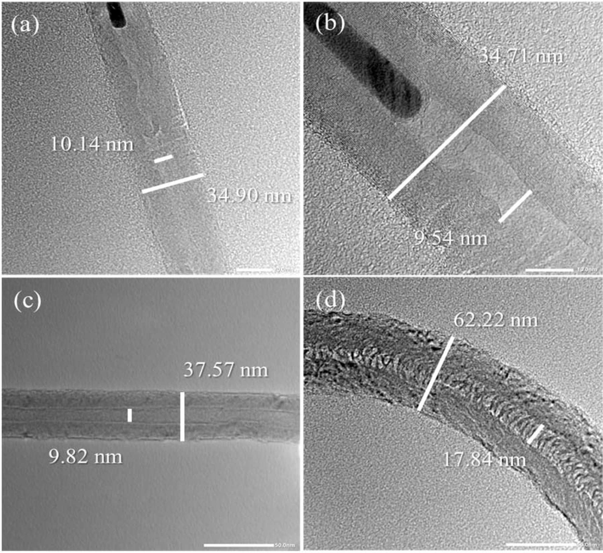 Fig. 4 HRTEM image of CNTs synthesis on (a) Fe-, (b) Co-, (c) Cu-, and (d) Ni-LTA coated BCMs at 650°C for 60 min. |