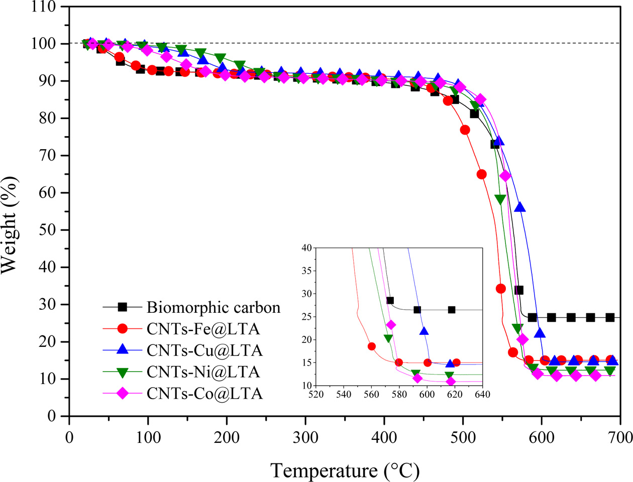 TGA curves of CNTs are shown in Fig. 5. All CNT samples represent an initial weight-loss (up to ca. 195 oC) tendency, which may involve the loss of physically adsorbed water on LTA template part of BCMs. The weight loss due to combustion of carbon begins at temperature of ≥ 400 oC depending on the carbon species [18]. All samples a two-step combustion process can be identified. The first stage (385 oC ~ 470 oC) corresponds to the combustion of the amorphous carbon species, and the second stage (480 oC ~ 618 oC) is the weight reduction due to the combustion of multi-wall carbon nanotubes with varying degree of graphiti- zation. The MWCNTs has combusted until ≥ 620 oC. After that, the samples keep a weight-loss pattern due to biomorphic carbon combustion. The main reason for the two-step pattern was that decomposition of C2H2 on metal catalysts leads to the formation of CNTs [19]. During the heat treatment process, the oxidation reaction of the metal catalyst nanoparticles did not occur, so that the weight gain was not observed. The carbon yield of CNTs synthesized by catalyst metal-containing CCVD is calculated as follows: