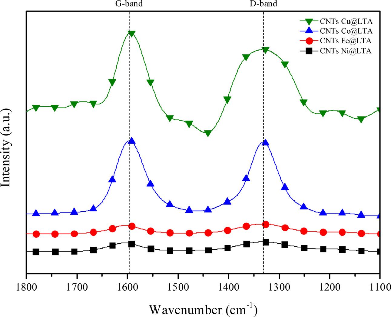 The strength of the G-band to D-band ratio is used to evaluate defects and qualitative properties of CNTs. The ID/IG values in this work are between 0.97 and 1.18, which is consistent with literature for MWNTs grown by CVD (ID/IG = 0.7-1.3), which represent high-quality grown CNTs [22]. CNTs grown on Ni-and Cu-LTA-BCMs show higher value of ID/IG ratio of 1.17 and 1.18, indicating the presence of structural distortion and more amorphous carbon [23]
