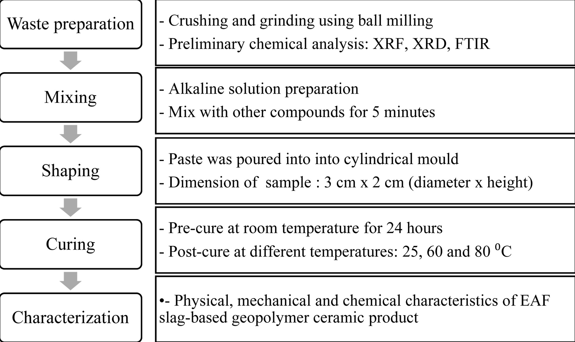 Nevertheless, none of research work has been reported on developing of geopolymer chains from combination of EAF slag waste and clay. Previous FTIR (Fourier Transform Infra Red) analysis has revealed that the slag generally consists of functional groups such as silico-aluminate (-Si-O-Al-O-) and/or ferro-silico-aluminate (-Fe-O-Si-O-Al-O-) while clay consists of silico-oxide (silico-oxide: -Si-O-Si-O) functional group [24, 25]. Subsequently, through alkaline activation of curing process, there is a high likelihood for the functional groups (from EAF slag and clay) to chemically react and form a new geopolymer network in the geopolymer ceramic product. Therefore, the purpose of this work is to preliminary investigate the potential utilization of EAF slag into geopolymer ceramic including different body formulations and curing parameters. The results discussed will be based on the physical and mechanical properties, as well as mineralogical property of the EAF slag waste-based geopolymer ceramic.