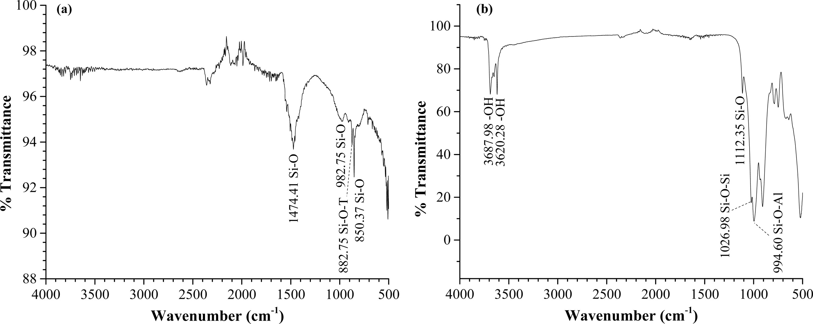FTIR spectra with the functional groups present in EAF slag and China clay is illustrated in Fig. 3 (a) and (b), respectively. Dakhane et al. [31] have reported that vibration modes of silica bonds can be observed in the range between 400 to 1,200 cm-1. In this work, Fig. 3(a) shows that the prominent peaks of EAF slag at 850.37 and 882.75 cm-1 which represents the symmetric stretching of Si-O bond and asymmetric stretching vibration bond of Si-O-T (T=Si or Al). The other functional groups present in EAF slag can be seen at 982.75 to 1,474.41 cm-1. These peaks attributed to the asymmetric stretching vibration of Si-O/Al-O, respectively [32].