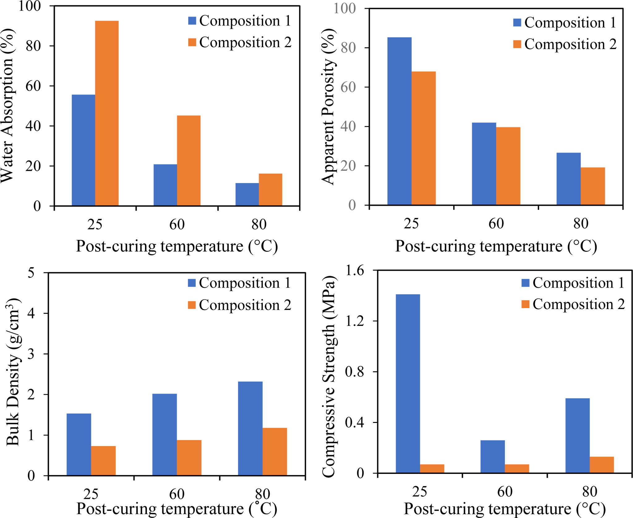 The physical properties of for EAF slag-based geopolymer with different compositions and post-curing temperatures are shown in Fig. 5(a-c). The water absorption for Composition 1 is lower than Composition 2. This indicates that the water accessibility in Composition 1 is unfavourable which can be related to the low apparent porosity and high bulk density as supported in Fig. 5(b) and (c), respectively.