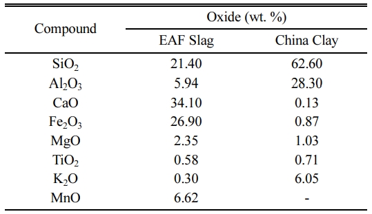 The chemical composition of raw materials; EAF slag and China clay obtained from XRF analysis is tabulated in Table 2. It can be seen that EAF slag contains a higher percentage of CaO and Fe2O3. Normally EAF contains about 15~30% of iron [26]. This indicates that the high content of both oxides in EAF slag is suitable for acting as a fluxing agent for geopolymerization [27]. Meanwhile, China clay composed of a high content of SiO2, Al2O3 and K2O, which is normally known as the aluminosilicate sources for geopolymer fabrication [28-30].