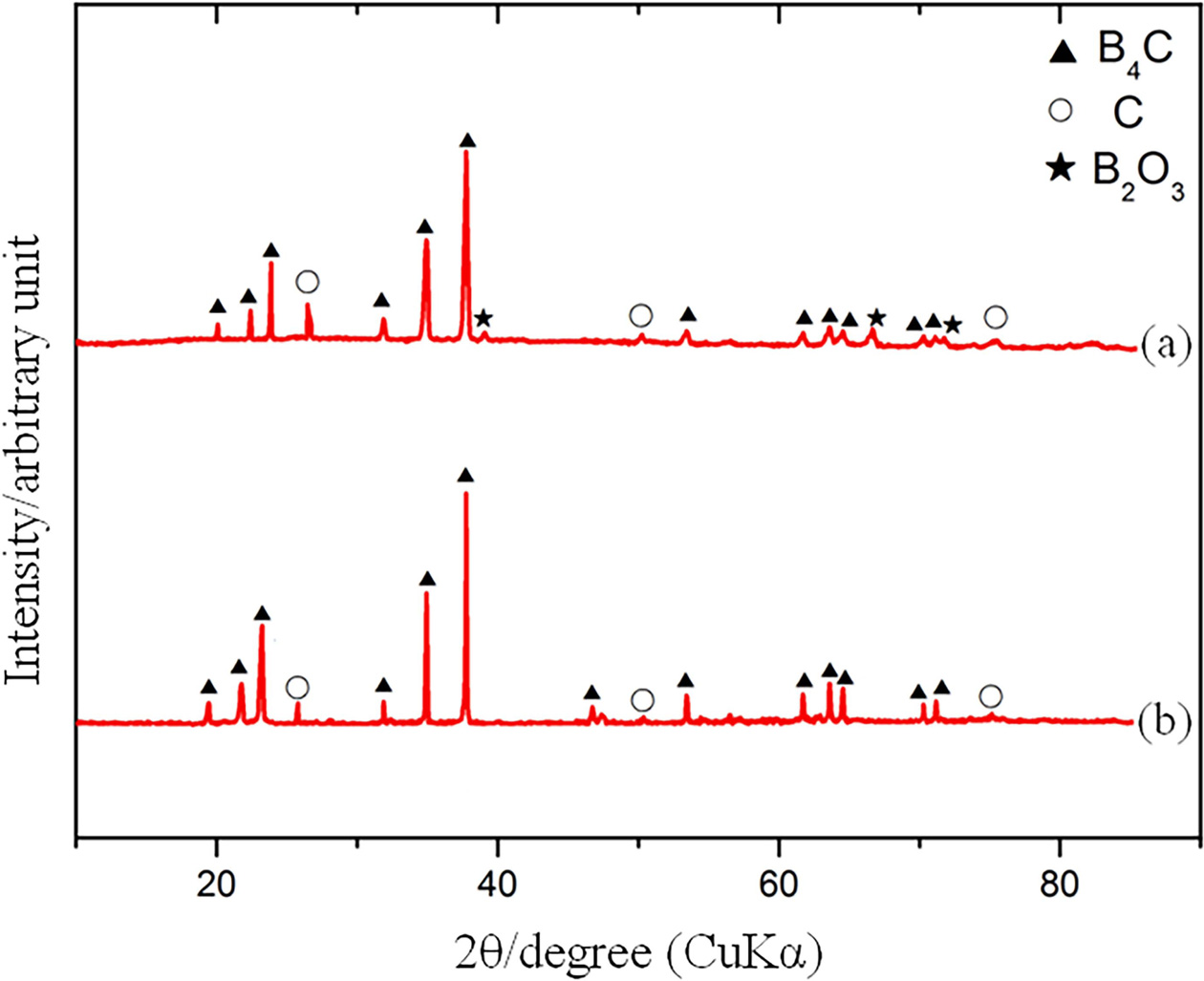 The XRD patterns of the specimen before (a) and after (b) microwave sintering are shown in Fig. 2. Besides B4C, carbon and B2O3 are detected phase according to curve a. After microwave sintering, the diffraction peaks associated with free graphite reduce greatly and no B2O3 is found according to curve b. This phenomenon indicates that some C react with B2O3 and generate B4C. The reaction temperature is about 1350 oC according to the research of G. Arslan [44]: