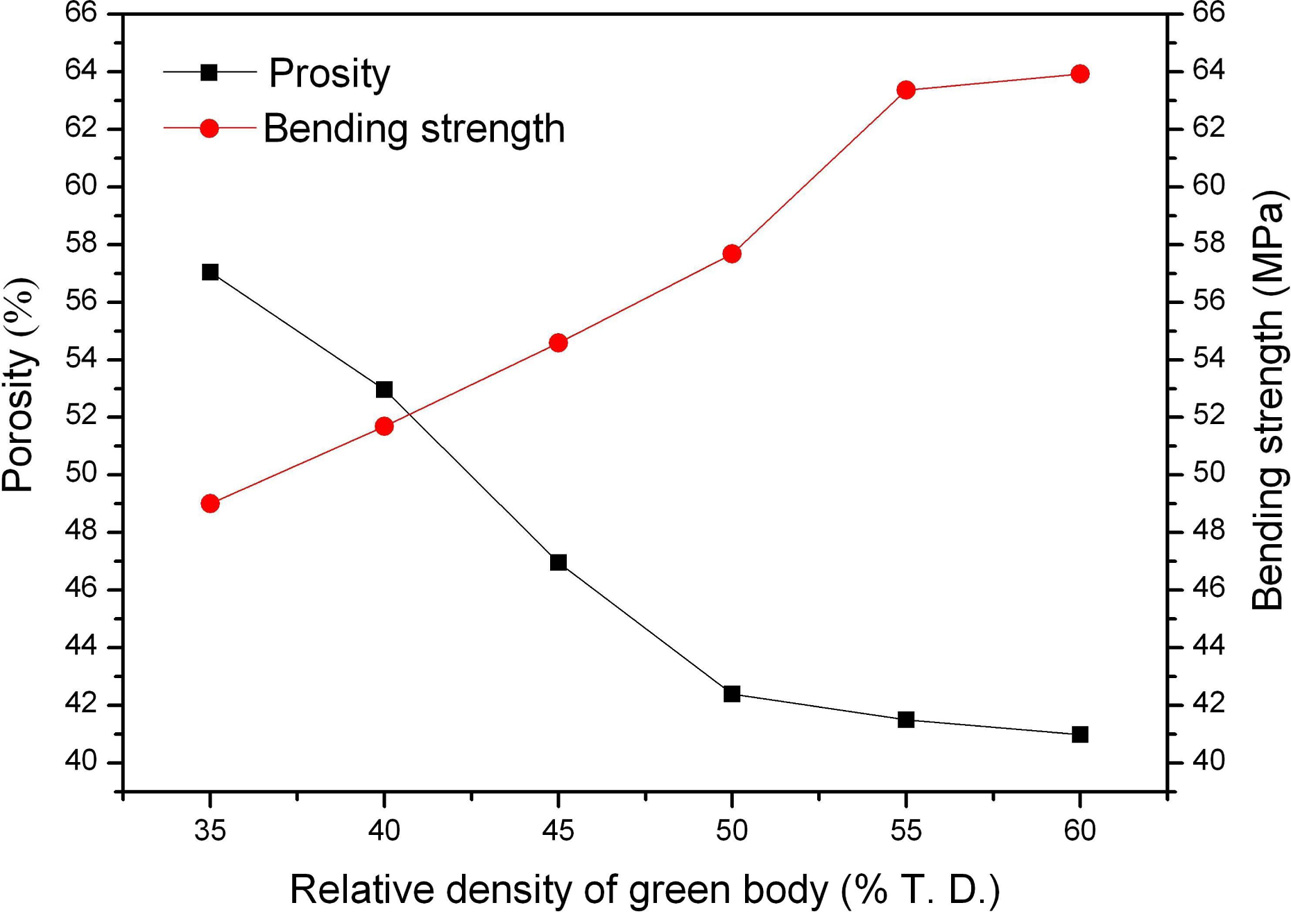 Fig. 3 Porosity and bending strength changes as a function of the relative density of green body. |