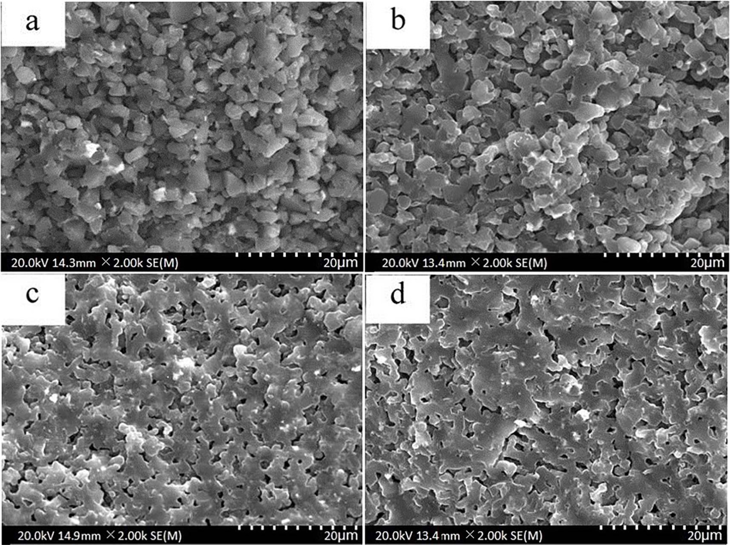 The properties of prepared ceramics skeletons are remarkably influenced by the pore size and morphology [48-50]. Fig. 5 shows the microstructure of porous B4C samples sintered from green pressing with different relative densities (35% T.D., 45% T.D., 50% T.D. and 60% T.D.). A limited sintering can be appreciated from Fig. 5(a), a sample sintered from the pressing gets the lowest relative density. Porosity is considerably large because the distance between boron carbide particles is long and the structure basically remains its initial states. When the relative density of green pressing increases to 45% T.D. (Fig. 5(b)), obvious sintering necks are found. With the further increasing in the relative density, the well-sintered samples with uniform structure and micron pores which are nearly round in shape are obtained (Fig. 5(c) and (d)). This appearance is probably resulted from the shortening of the diffusion distance because of the increase in the relative density of green body.