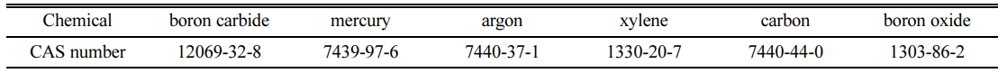 Archimedes method with xylene as the immersion medium was using to measure the relative densities of the green bodies. Porosity and average pore size of as-prepared B4C ceramic skeleton was measured using a mercury porosimetry (Auto Pore IV 9500, Micromeritics Instrument Corporation, USA). The phases in the samples were characterized by X-ray diffractometry (X' Pert PRO MPD, PANalytical, Netherlands) with CuKα radiation (λ-1.5406Å) operated at 40kV and 40mA. And the scanning speed was 1o/min for 2θ, divergence and scattering slit widths were set as 1o while the receiving slit width was set as 0.36 mm. Sintered pellets were cut, polished with 2500-grit paper and then gold-coated for microscopic observation. The microstructure was detected by the scanning electron microscope (SEM) (S-4800, Hitachi-hitec, Japan). The flexural strength at room temperature of sample was determined by three-point flexural test on a universal testing machine (E45, Mechanical Testing and Simulation incorporated, USA) with a loading rate of 0.5 mm/min. The dimension of the test piece was 15 mm×15 mm×10 mm. Hardness test was performed by a Rockwell indentor (HR-210MR, Mitutoyo Instrument Company, Japan) with a load of 60 kg. All results were repeated for five times, and then take an average. CAS numbers for all chemicals mentioned above are listed in Table 1.