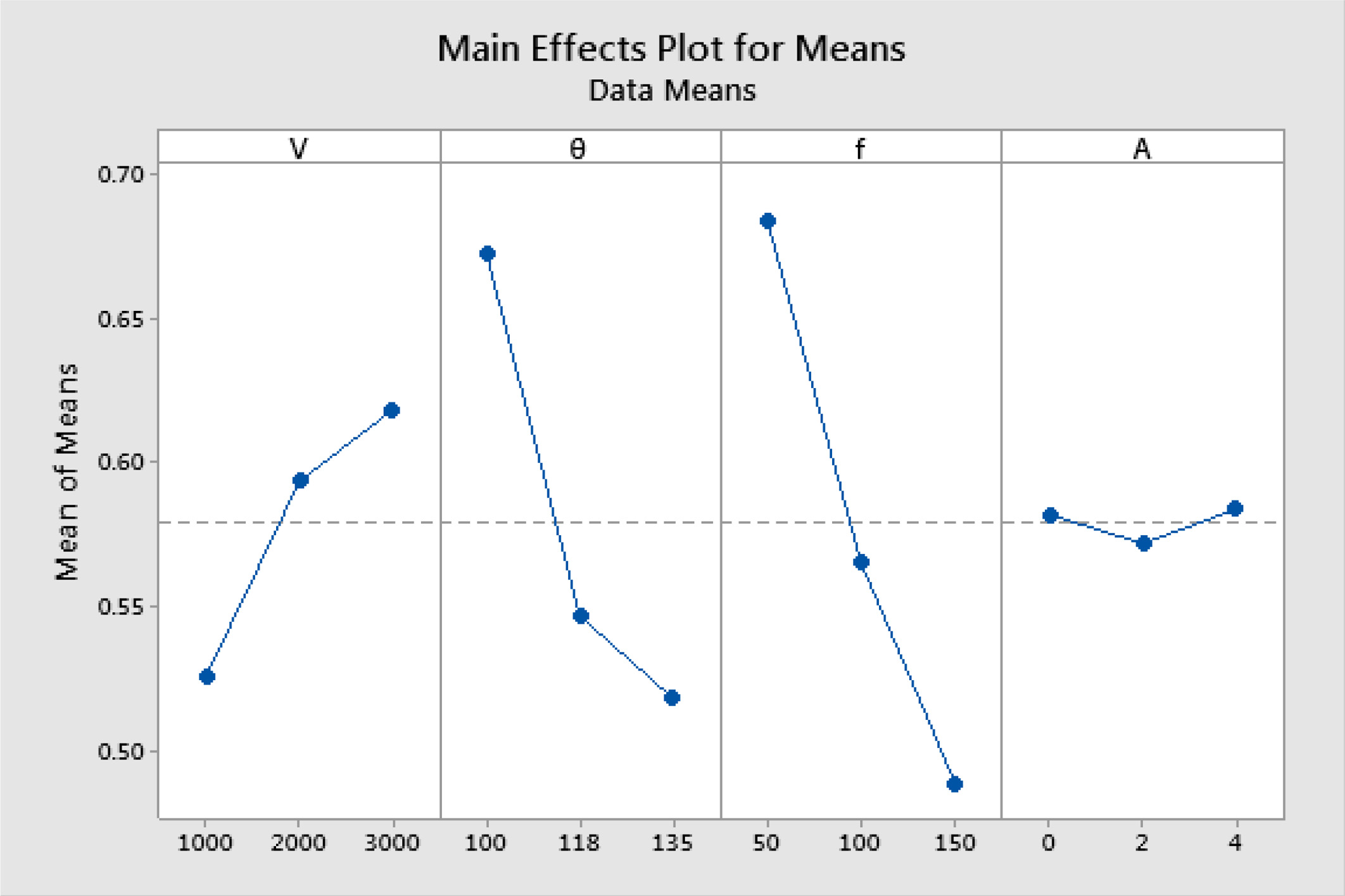 Based on the GRG response table (Table 8), the feed rate is found to be the foremost dominant factor on multiple performances followed by point angle, spindle speed and wt% of Al2O3. Consequently it was revealed that the drilling conditions of 3000 rpm spindle speed, 100° point angle, 50 mm/min (f) and 4 wt% of Al2O3 provide the optimal combination for drilling of CFRP composites. The main effects plot in Fig. 2 represents this.