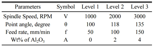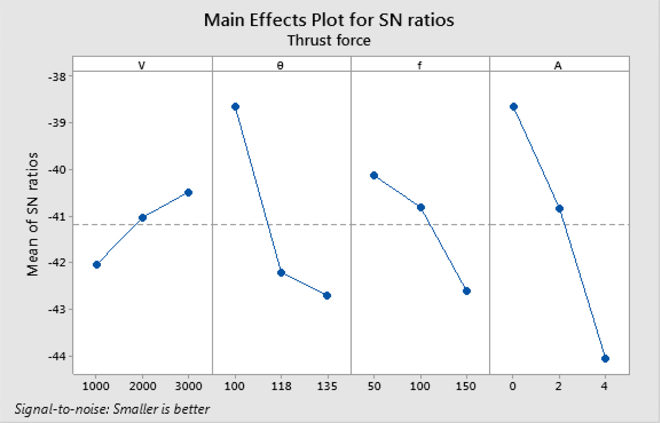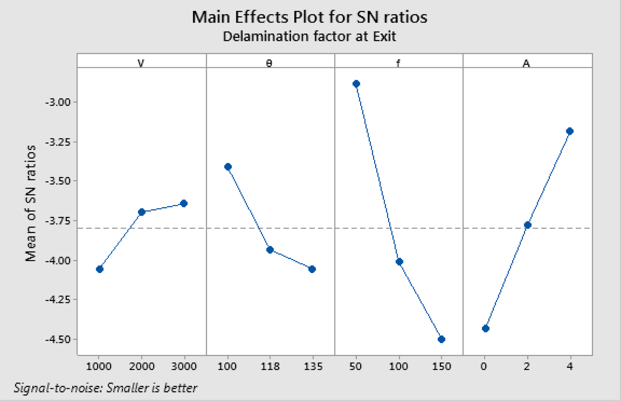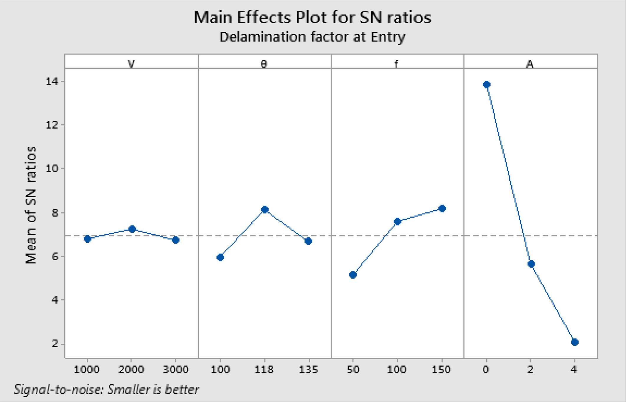 Figs. 4, 5, 6, and 7 denote the main effect plots for D-Entry, D-Exit, Ra and F respectively. The maximum S/N ratio of factor level assures the best conditions. Consequently it is noted from Fig. 4 and 5 that spindle speed at 3000 rpm, point angle at 100°, feed rate at 50 mm/min and incorporation of 4 wt% Al2O3 are the optimal conditions for obtaining lesser D-entry and D-exit. Fig. 4 & 5 also reveal that the D-entry and D-exit holes get enlarged with increase in feed rate while it gets decreased with raise in wt% of Al2O3. But spindle speed at 3000 rpm, point angle at 100°, feed rate at 50 mm/min and without incorporation of Al2O3 are found to be better combination to achieve lowest surface roughness and cutting force as exposed in Fig. 6 and 7.