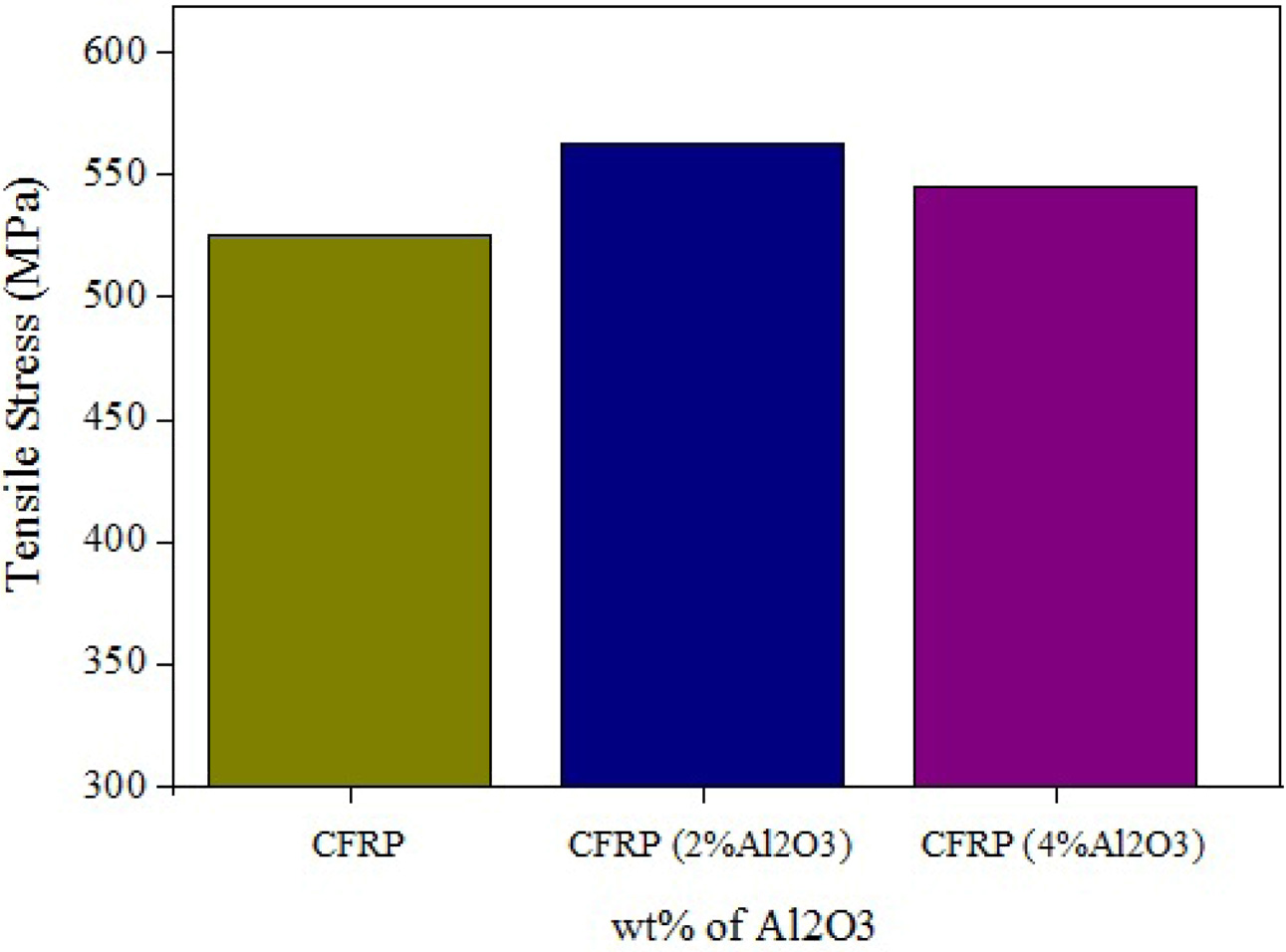 It is obvious from Fig. 9 that with an increase in wt% of alumina in the epoxy matrix, the tensile strength (TS) increases up to a maximum value and decreases consequently for higher concentration due to the agglomerations of nanoparticles [27]. It is observed that CFRP composite with 2% Al2O3 revealed more TS compared to others.