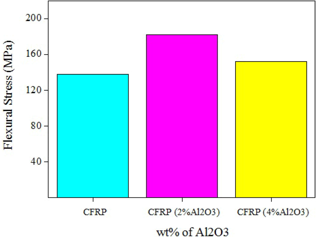 The three point bend test is conducted on CFRP composite samples as per ASTM D790 standard. The size of the specimen was 200 mm ×12.7 mm × 3 mm with a length of 50 mm and 1.5 mm/min cross head-speed maintained for the test. It is obvious from Fig. 10 that with an increase in wt% of Al2O3 in the epoxy matrix, the flexural strength (FS) increases up to an inclusion of 2% concentration and gets reduced afterward for 4 wt% of Al2O3 due to nanoparticle agglomerations. The enhanced FS was due to the better dispersion of Al2O3 nanoparticle in the epoxy matrix and at greater concentration, aggregation of Al2O3 naonoparticles occurs which decreases the FS of the composites [28].
