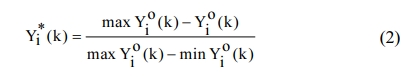 where Yi*(k) - normalized data, Yio(k) - original sequence, maxYio(k) - greatest value of Yio(k), and minYio(k) - lowest value of Yio(k).