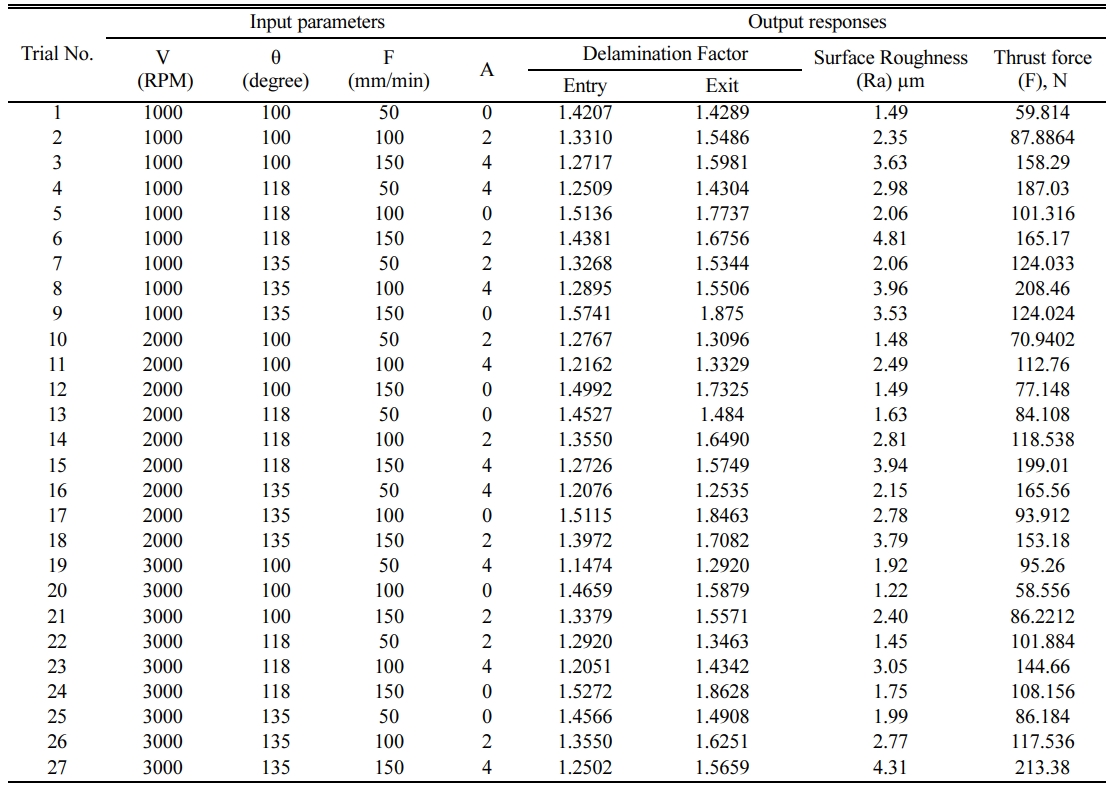 The drilling operations were carried out in the CNC vertical machining center - ARIX VMC 100 under dry conditions using HSS twist drill. The drilling parameters used in the study are provided in Table 5. In this work, L27 OA design was utilized to conduct the drilling experiments on the plates. The holes were photographed using CANON EOS 5D Mark III camera and the digital images analysed using CORELDRAW software. Ra and thrust force were measured by Mitutoyo surface roughness tester (Model: Surftest-211) and dynamometer (Kistler-9257B type) respectively and the instruments are shown in Fig. 1. And Table 6 presents the measured output responses. Delamination factor was calculated using the formula given below [22].