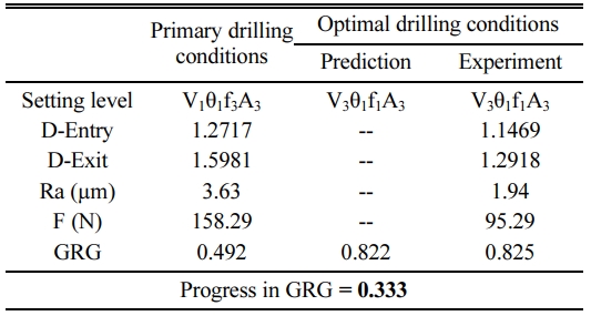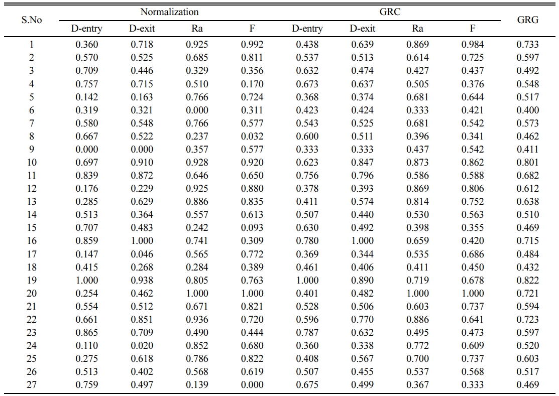 The aim of the optimization work is to minimize the D-Entry, D-Exit, Ra and F using Taguchi based GRA technique. Normalization values were calculated using Equation (2) and its plot is shown in Table 7. Equation (3) is used to compute the GRC values for all the output responses and presented in Table 7. Lastly the grey relational grade (GRG) was assessed by averaging the sum of GRCs by using Equation (4) and the values obtained are given in Table 4. The greater the GRG, it indicates that the quality characteristics are better. Trail 19 has the highest GRG value of 0.822 and it is the best multiple output response among the 27 runs [25].