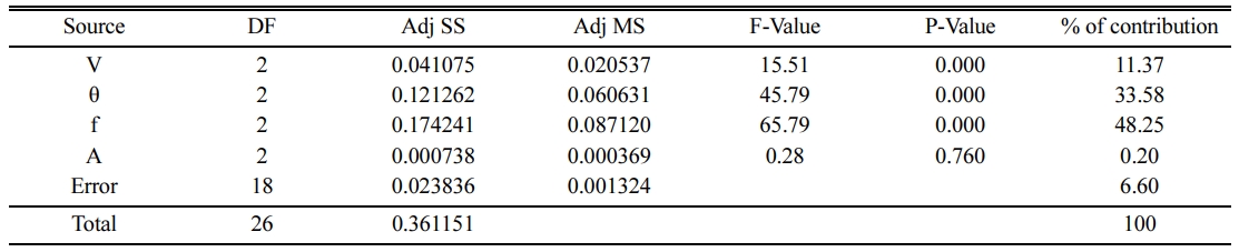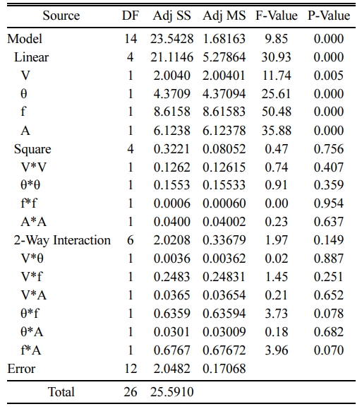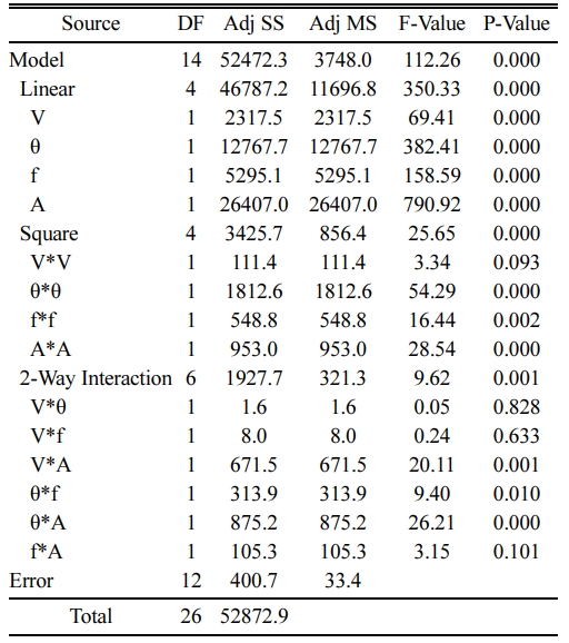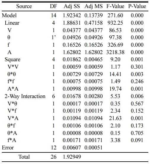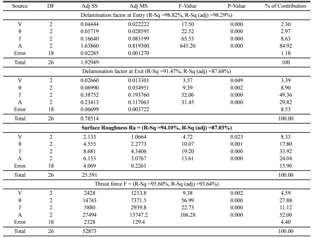 The second order quadratic regression models for D-entry, d-exit, surface roughness and thrust force were developed through RSM [26, 29]. Additionally, ANOVA for the output response are shown in Tables 12, 13, 14 and 15. Based on the results obtained from the drilling operations conducted on CFRP composites the equations obtained for D-entry, D-exit, Ra and F depending on the input parameters are as follows.