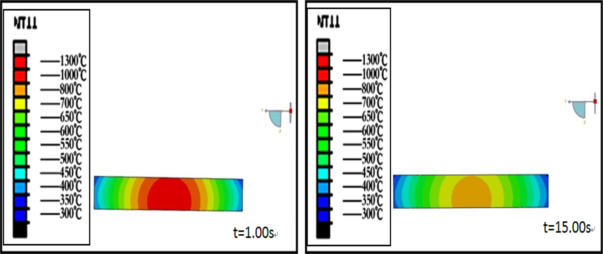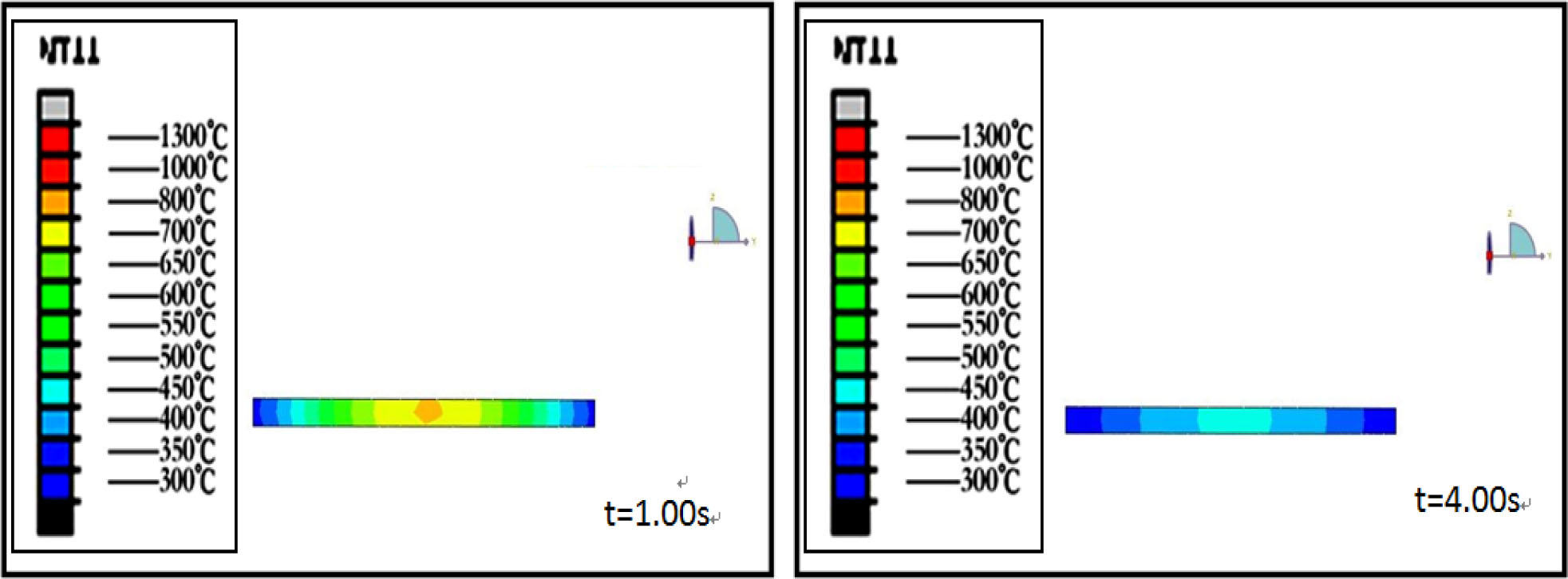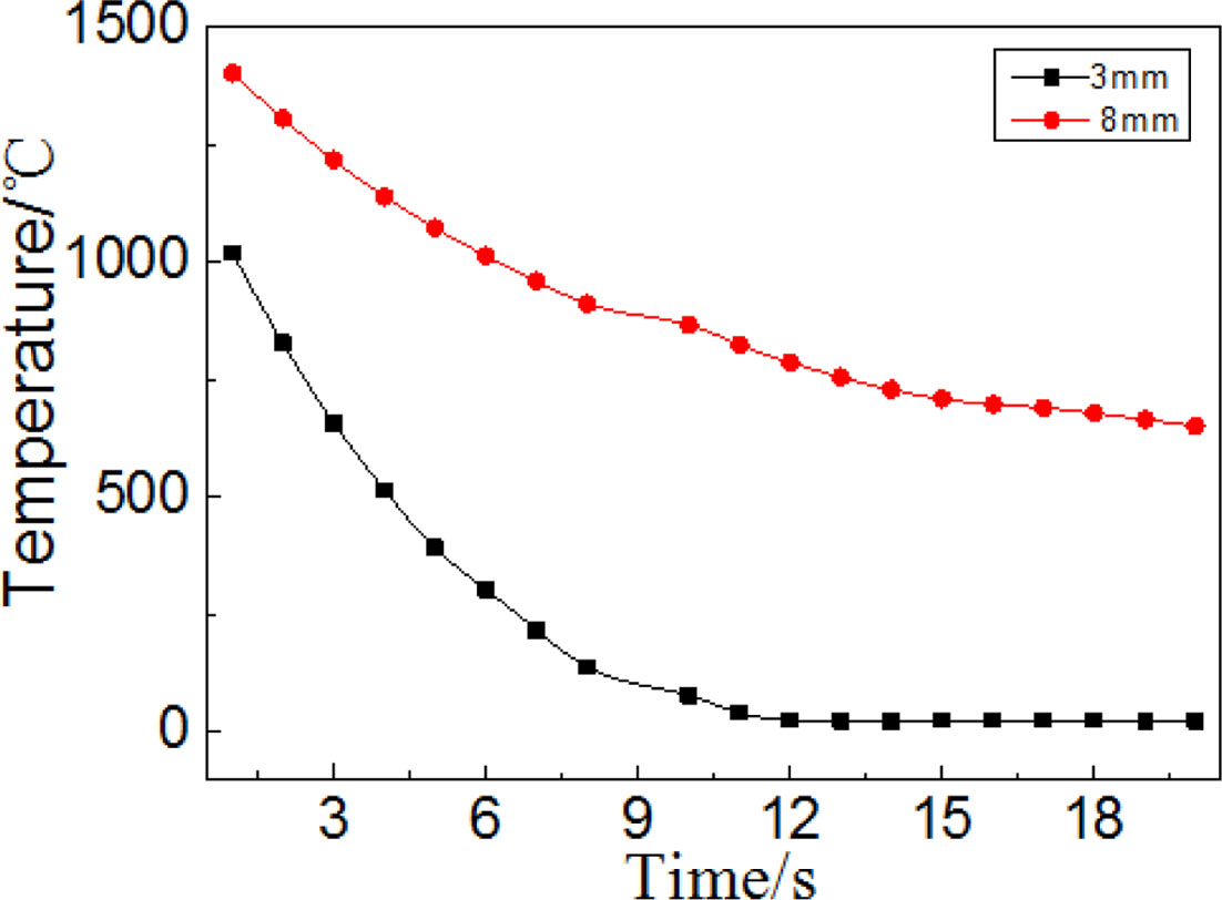 Fig. 1 and 2 are the temperature field simulation results of 3 and 8 mm thick precursor glass during molding process which was taken by Abaqus Finite Element Analysis. It can be seen from the figures that the temperature of precursor glass decreases with the prolongation of cooling time. The core temperature of 3mm thick glass dropped to 500 oC after molding for 4s, but the core temperature of 8 mm thick glass is still as high as 710 oC after molding for 15 s.