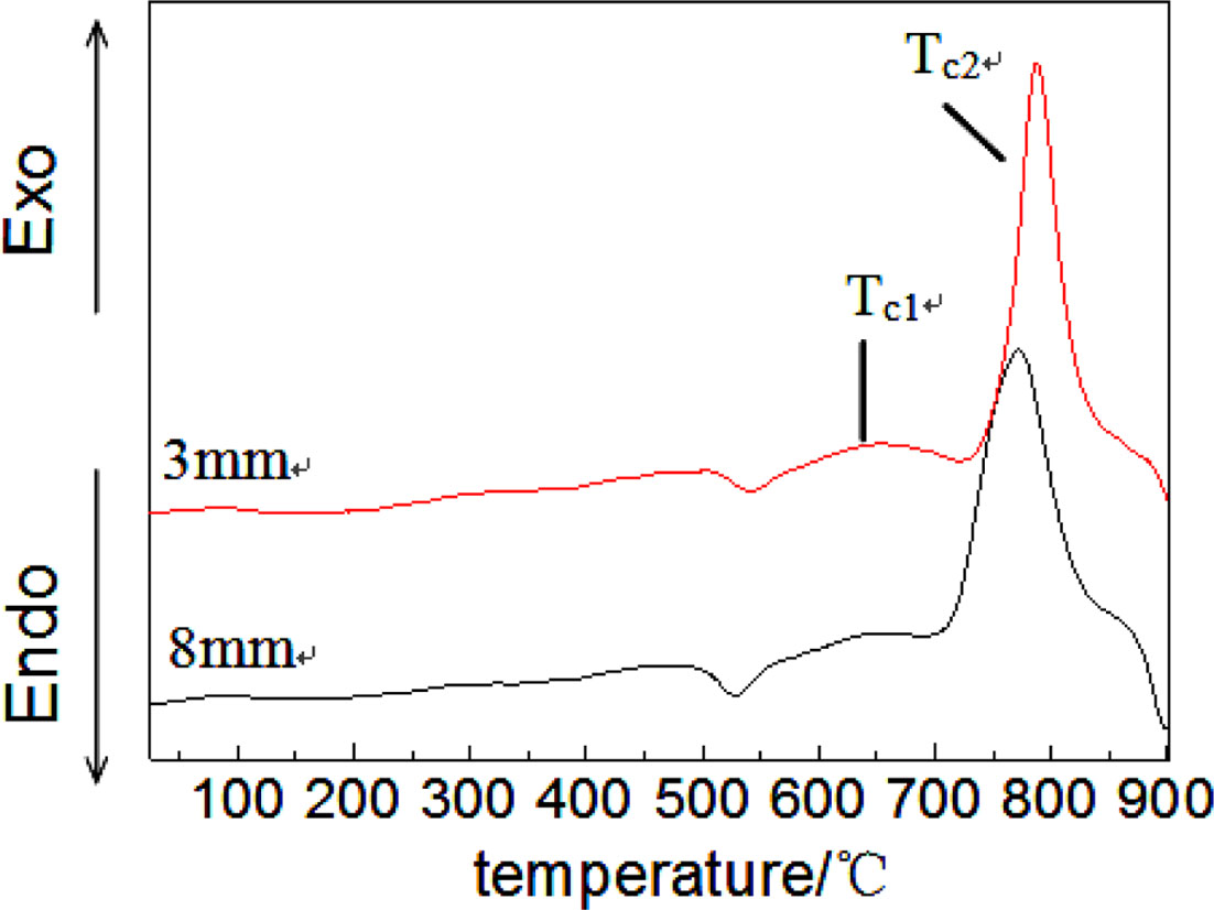 Fig. 3 is a curve of temperature variation related with cooling time, as can be seen, the cooling rate of 8mm thick precursor glass is obviously slower than that of 3mm thick glass. The center temperature of 3 mm thick precursor glass tend to stabilize when the cooling time exceeds for 8 s, which is far below the crystallization temperature; on the contrary, the center temperature of 8 mm thick precursor glass still maintain high (>650 oC) for it has a poor heat dissipation property. Due to the crystallization temperature of precursor glass is 650 oC (Fig. 4), so the initial nucleation will generate when the interior temperature of precursor glass is above the crystallization temperature. Then, the initial nucleation will grow up preferentially during the next heat treatment processes, which has a serious impact on the structure uniformity and the appearance of precursor glass. Therefore, the preparation process should be adjusted so that the integrated temperature of the pre- cursor glass can rapidly decrease to below the crystalli- zation temperature, in order to prevent the occurrence of interior crystallization phenomenon.