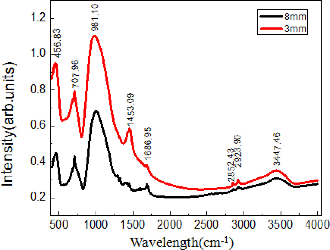 Fig. 5 shows the infrared optical absorption spectra of Al2O3-SiO2-Na2O-CaF2 precursor glass with different thickness, where the absorption peak at 1,686.95 cm-1 is caused by hydroxyl(-OH) which cling to glass surface; besides, absorption peak at 1,453 cm-1 is corresponding to the dissymmetry vibration of bond (Si-O-Si) and stretching vibration of bond (O-Si-O). The Si−O−Al bond’s absorption peak is at 1000~600 cm-1, and the absorption peak at 456 cm-1 is corresponding to the vibration of [SiO4]4-. Studies [10, 11] have shown that Al3+ and Ca2+ ions will replace the Si4+ ion of [SiO4]4− when the precursor glass transforms into glass-ceramics, which causes the vibration of O−Al bond. The infrared absorption band of 8 mm thick glass that with lower cooling rate is significantly wider than that of 3 mm thick glass, which indicates that the microstructure of precursor glass has been changed. The reason is that the electron negativity of Al3+ and Si4+ is lower and part of Al3+ ions will substitute the Si4+ ions in the [SiO4]4-, while the polarity and the vibration frequency of Si-O-Si bond are increasing, which leads to the bandwidth of the corresponding infrared absorption peak and lower intensity. The substitution of Al3+ ion is proof contribute to the generation of initial nucleus inside precursor glass, which means the amorphous structure of the precursor glass has been destroyed. Due to larger thickness precursor glass has a lower cooling rate, the internal temperature is higher than the crystallization temperature, which is beneficial to the formation and growth of crystals. Thus conclusion is consistent with the results of finite element analysis.