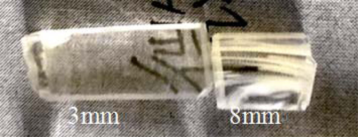 Glass ceramics is obtained by thermal treatment at 650 oC for 3 hrs, the appearance digital pictures of glass ceramics are shown in Fig. 6. Obviously, the glass ceramic that was produced by 3 mm thick precursor glass remains transparent, differently, as can be seen from the ceramic glass prepared by 8mm thick precursor glass, there are some milky stripes in the glass ceramic, which caused devitrification.