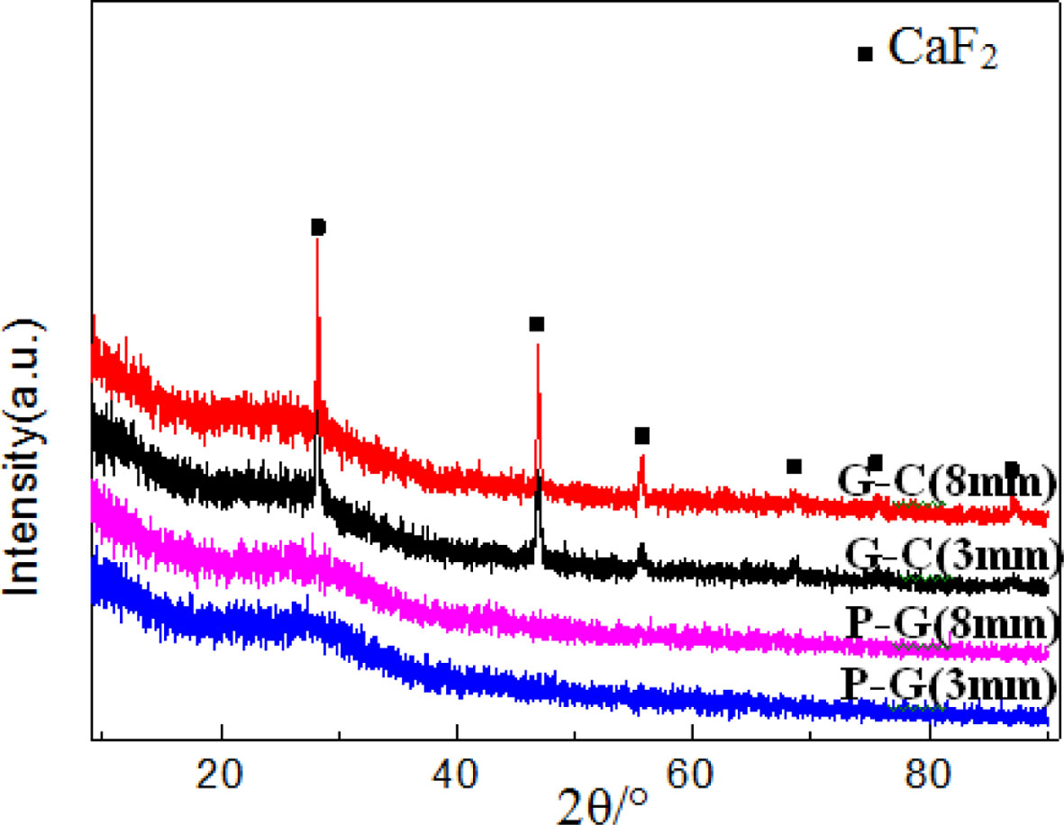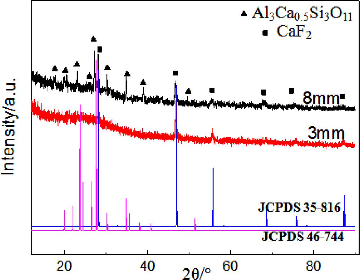 Where D is grain size, k is the Scherrer constant taken to be 0.89, λ is the wavelength of X-ray, β is the width of half height, and θ is the angle of diffraction. The grain size of ceramic glass with different thickness (8 mm, 3 mm) is approximately 50 nm and 20 nm; in order to analysis the internal phase composition of the glass ceramic, we precisely cut the 8 mm thick glass ceramics, so does 3 mm thick glass ceramic for com- parison. We found the XRD patterns (Fig. 8) about the milky area of 8 mm thick glass ceramic is interesting, it can be learned, in addition to larger grain size (60 nm) CaF2 nanocrystalline precipitated in interior, it also precipitated Calcium Aluminum Silicate (Al3Ca0.5Si3O11) phase; but for glass ceramic of 3 mm, there was only CaF2 crystal phase inside it. So, it’s identified the microstructure and phase composition of inner and surface of 8mm thick glass ceramic are different, which is harmful to materials.