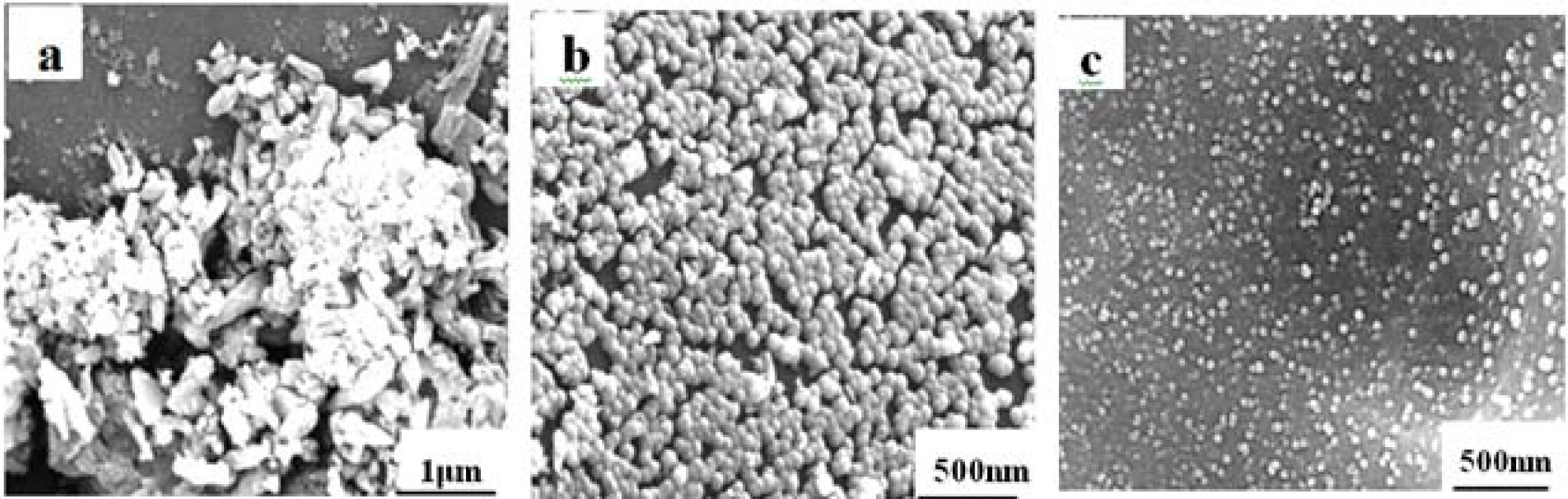 Fig. 9 SEM images of glass-ceramics, a. Milky portion of 8 mm thick glass-ceramics; b .Transparent portion of 8 mm thick glass-ceramics; c. 3 mm thick glass-ceramics |