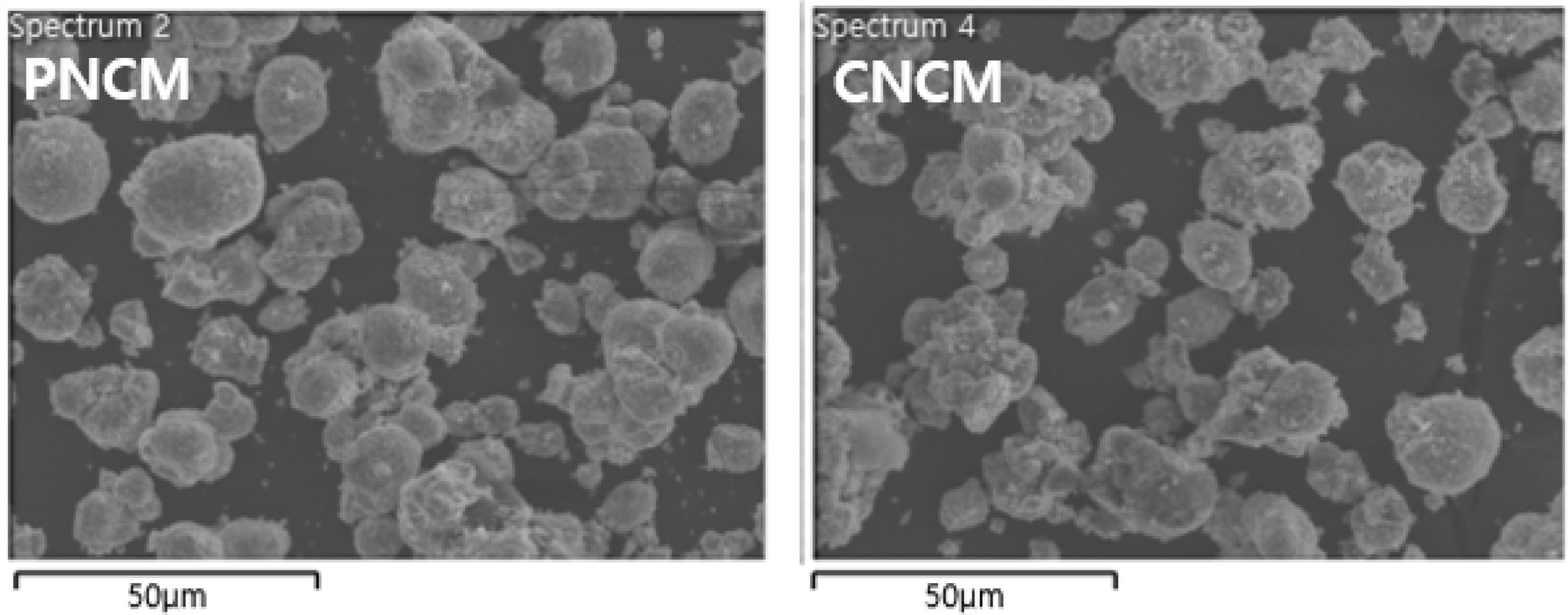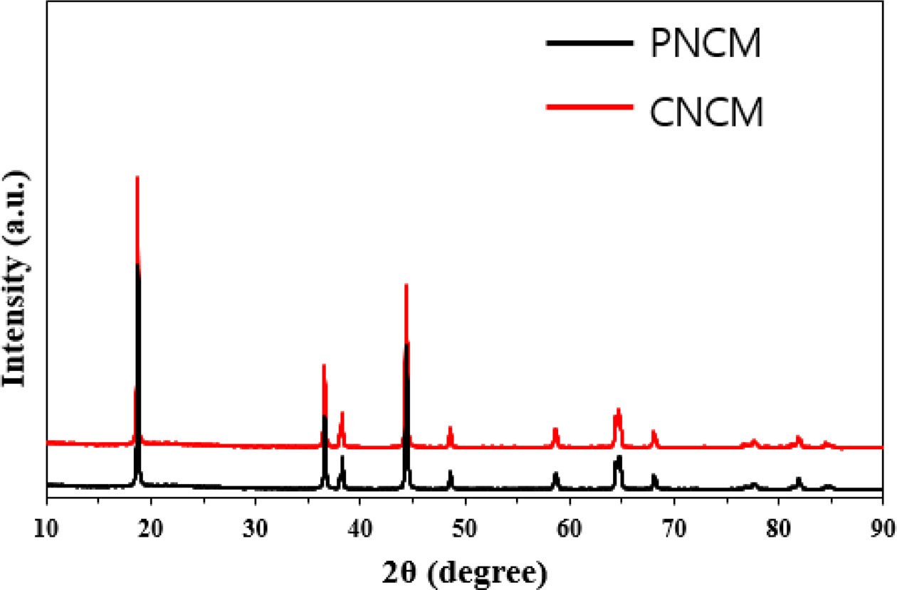 Fig. 2 shows the microstructures of the PNCM and CNCM. There is no obvious differences between both samples. The SEM images indicate that both samples exhibit the spherical granule morphology with average size of 10.5 μm, which is composed of numerous primary particles with average size ranged from 150 to 300 nm. This is typical shape of Ni-rich cathode powders. We can infer that coating does not change the shape and grain growth of PNCM. It is associated that Ni0.91Co0.06Mn0.03(OH)2 precursor act as a core and LiOH·H2O act as a nutrient, which is moves into the precursor. Both samples with pores shows high specific surface area, leading to excellent electrochemical per- formances via improved electrolyte wetting [4, 5].