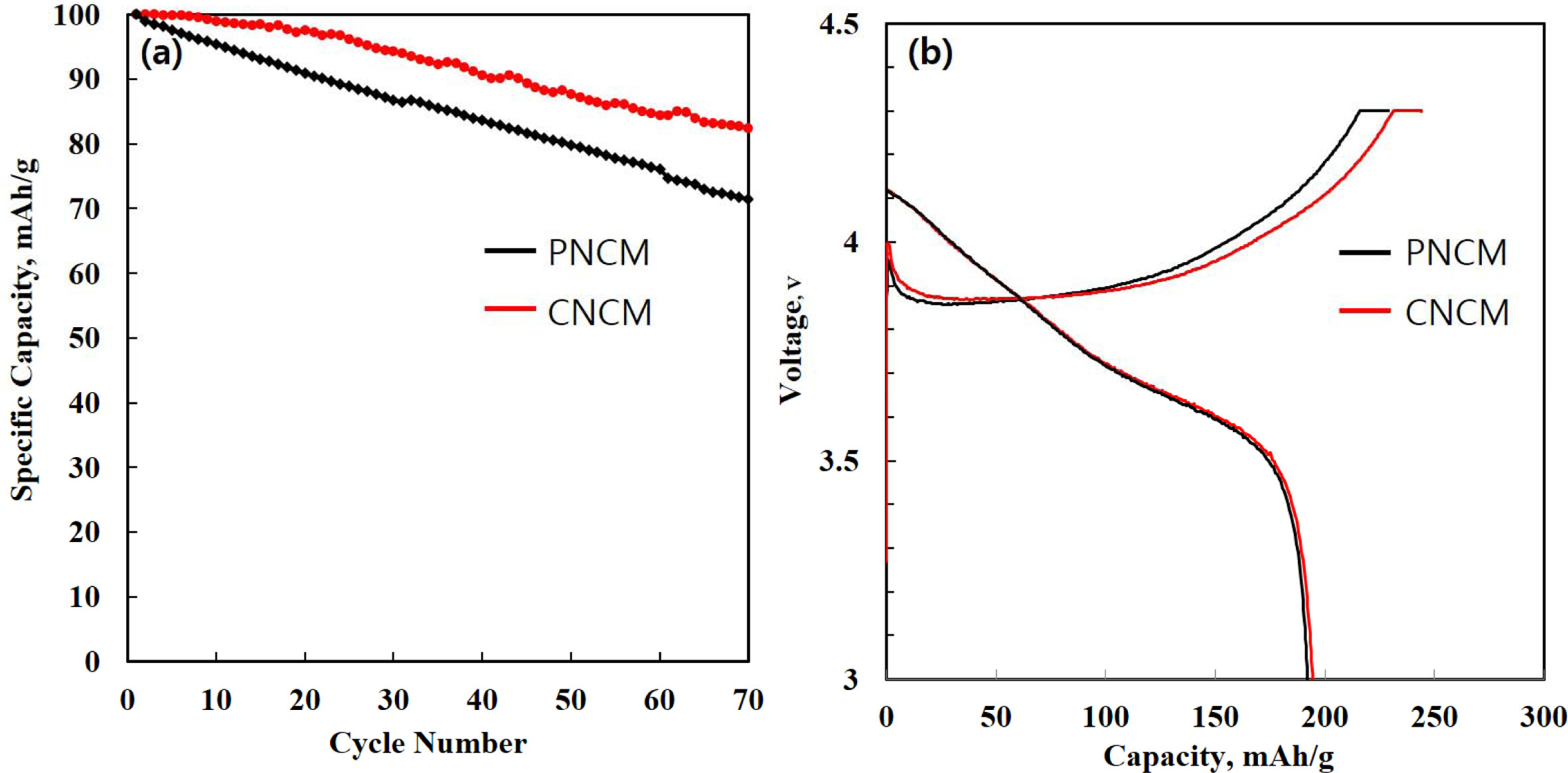 Fig. 4 (a) Cycle performance of PNCM and CNCM (b) initial charge-discharge curves of PNCM and CNCM. |