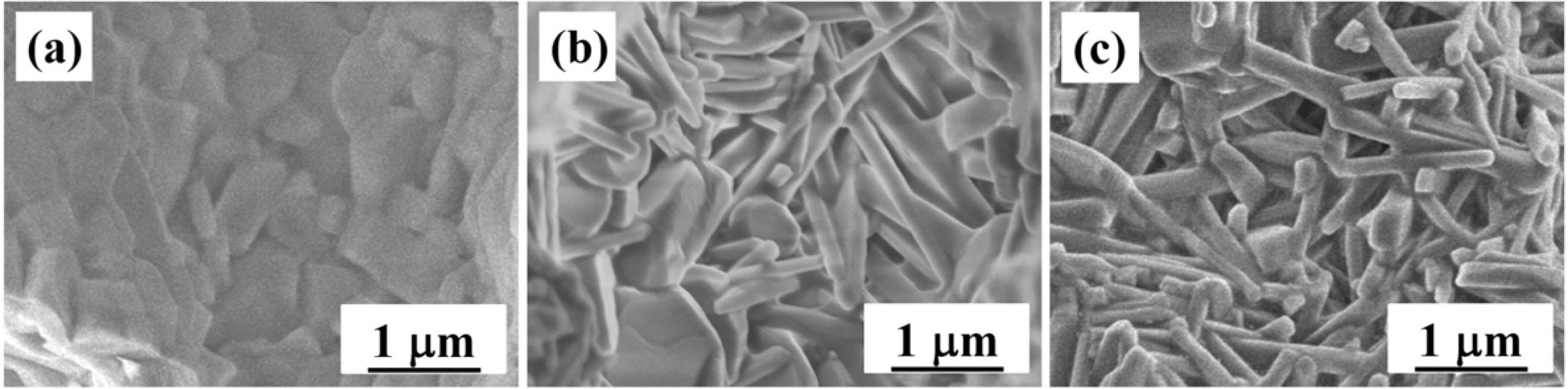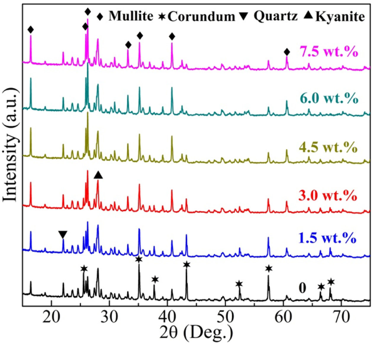Fig. 2 shows the SEM images of the particles fresh fracture with silicon carbide contents of (a) 0, (b) 3.0, and (c) 6.0 wt.%. It could be detected the particles without silicon carbide addition featured a compact structure, while they possessed some pores in the structure with further increased silicon carbide contents. The granular and angular microstructure transformed to acicular structure gradually with increasing addition of silicon carbide, because the main corundum phase converted to mullite phase in the structure, which was in line with the analysis in Fig. 1 [24]. The change of grain accumulation could lead to the formed pores in the structure, while the other foremost reason for the pores was the let out CO2 gas when the oxidation reaction of silicon carbide at a high temperature [12, 25].