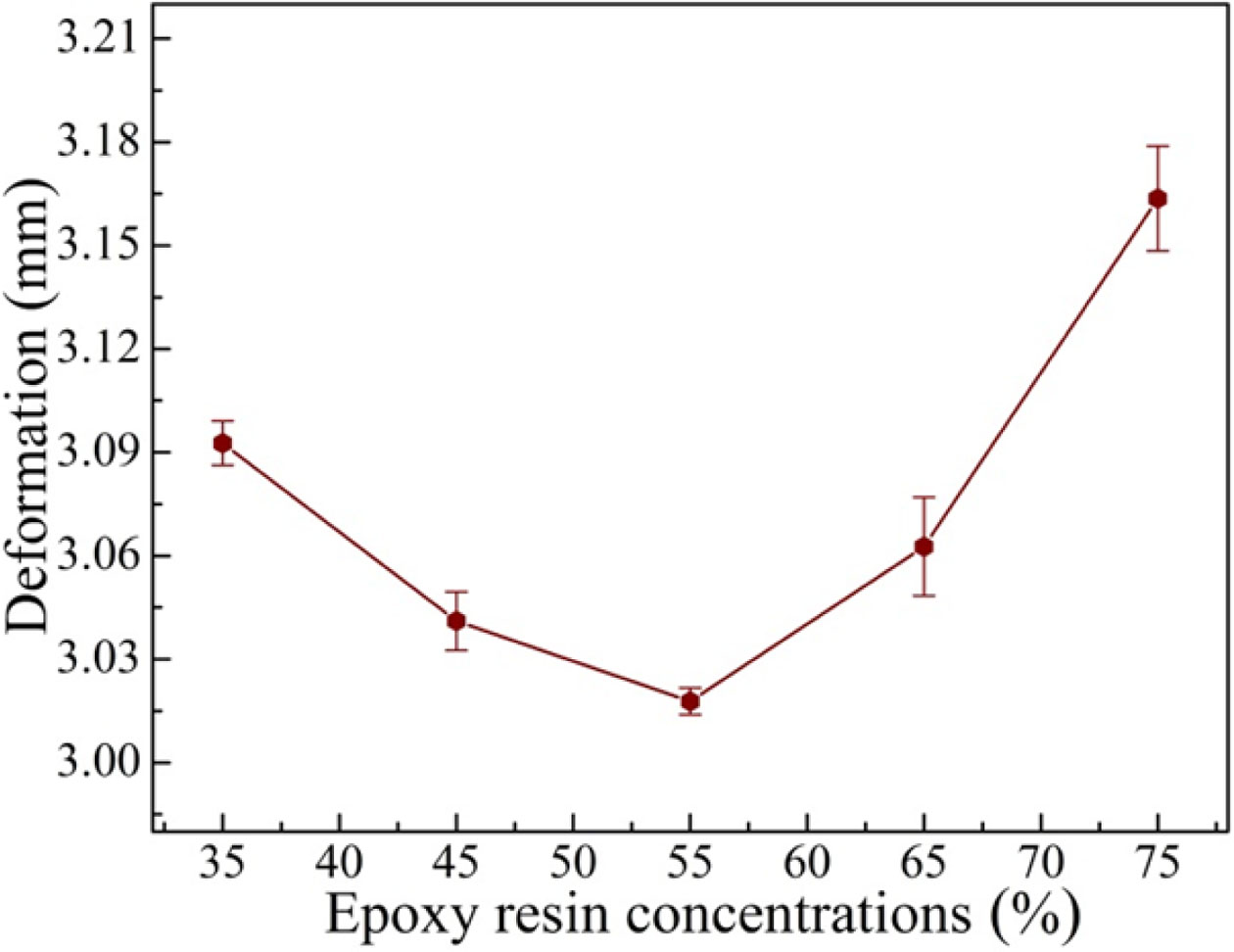 Fig. 3 displays the effects of epoxy resin concen- trations on the resin-impregnated ceramic particles deformation with 3.0 wt.% silicon carbide. It could be observed that the deformation of resin-impregnated samples reduced firstly, and then increased with the increment of silicon carbide. The various trend of deformation under different epoxy resin concentrations indicated the mechanical properties would be deduced with excessive epoxy resin contents, because the higher concentrations of the epoxy resin, the more epoxy resin filled in the pores in the structure and coated inside the porous particles, generally. The minimum deformation value (3.02 mm) was detected when the epoxy resin concentrations was 55 wt.%, implying the the resin-impregnated ceramic particles featured appropriate mechanical properties. The reason for the suitable epoxy resin concentrations were the rational viscosity and coating effect. That is, the poor coating effect with low epoxy resin concentrations and inferior impregnation into the pores with high viscosity were adverse to reduce the deformation. Moreover, the more epoxy resin coated on the ceramic particles, the larger deformation could also generate, which was the other reason for increasing deformation with excessive epoxy resin contents.