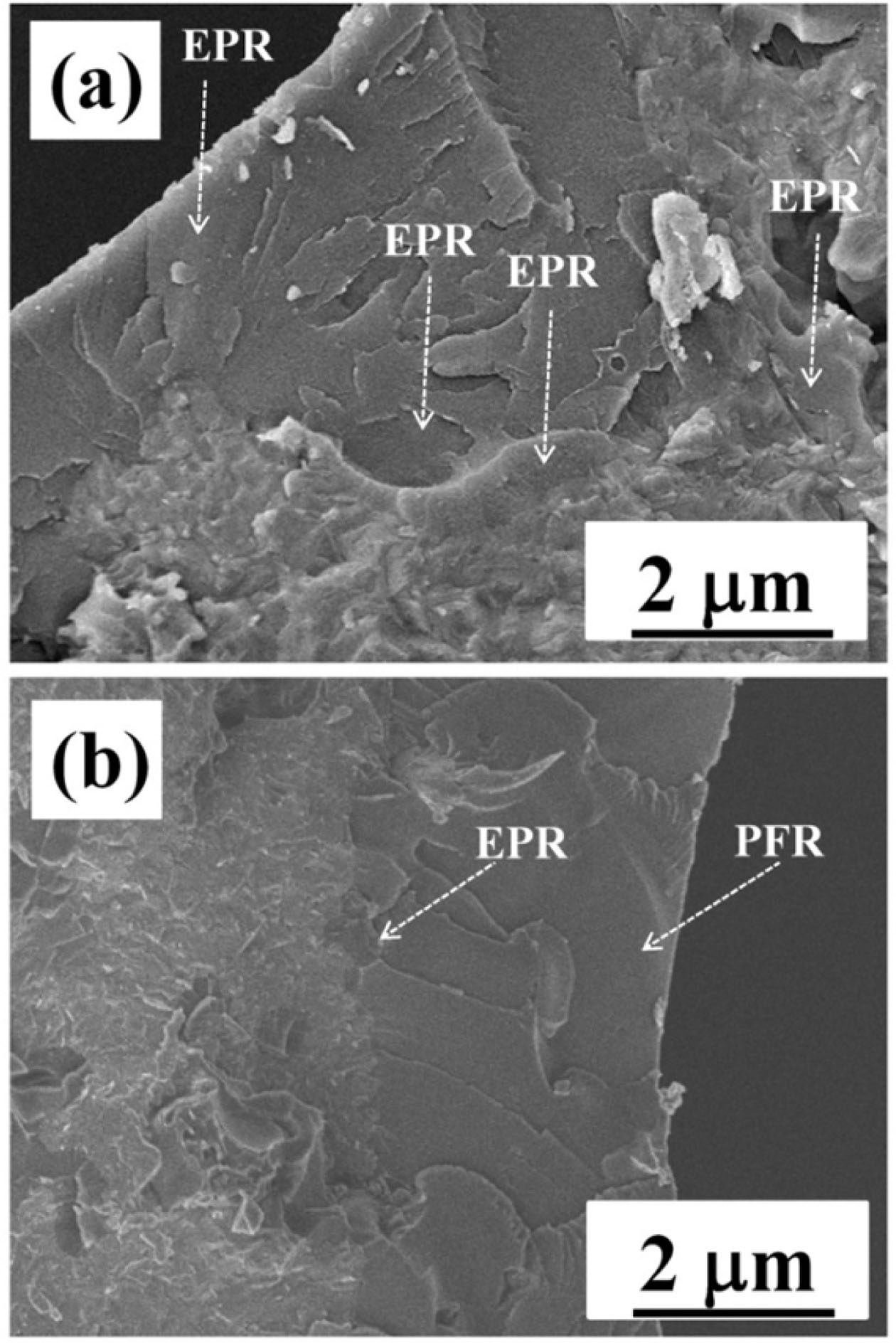 Fig. 5 shows SEM images of the resin-impregnated and double resin-coated ceramic particles fresh fracture boundary with 3.0 wt.% silicon carbide. It could be observed, there still existed some pores in the resin-impregnated ceramic particles, while the double resin-coated ceramic particles were completely filled with the resin. The filled resin in the pores in the structure and completely resin-coated on ceramic particles surface were all responsible for the improvement of their strength. Moreover, the surface was smoother in the double resin-coated ceramic particles than the resin-impregnated samples, which was helpful for its flow transitivity in the increasing oil and gas reservoirs. It could be detected EPR (~1.2 μm) and PFR (~1.6 μm) layers in Fig. 5(b), and the layers linked together closely. The outstanding resin layers in the ceramic particles could protect the ceramic particles from corrosion environment, improving the corrosion resistance in practical applications [19, 26].