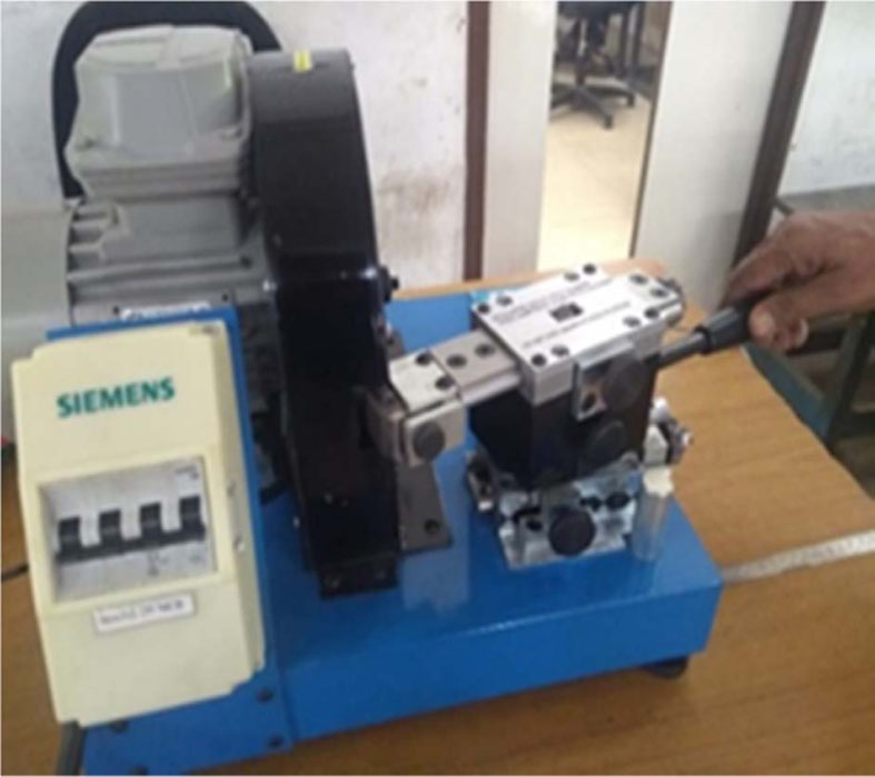 Brake pads were characterized for physical properties such as density (by water immersion method) and porosity (JIS-D 4118 standard) by picnometry. Thermal conductivity test was conducted using Thermal conduc- tivity analyzer (FL-3000) after cutting the brake pad to the size of 10 mm x 10mm and thickness of 2.5 mm. The surface is coated with graphite spray and measure- ments were carried out at 150 oC and 400 oC. Hardness is calculated in ‘S’ Scale using a Rockwell testing machine with a major load of 100 kgf. Shear strength (ISO 6312) is found by determining the force required to detach the friction material from the back plate by the pad surface area. For hot test, the pad is heated to around 200 oC and the same procedure is repeated. The friction performance was evaluated according to SAE J661 procedure in Indian Friction Material Engineering Company using a Chase Testing machine shown in Fig. 1. The sample of size one inch by one inch and thickness 8 mm is cut from the brake pad for testing purposes. The detailed test schedule is explained elsewhere [12]. The sample was then ground to precision to suit the diameter of the drum by developing a special grinding machine for this purpose (Fig. 2)