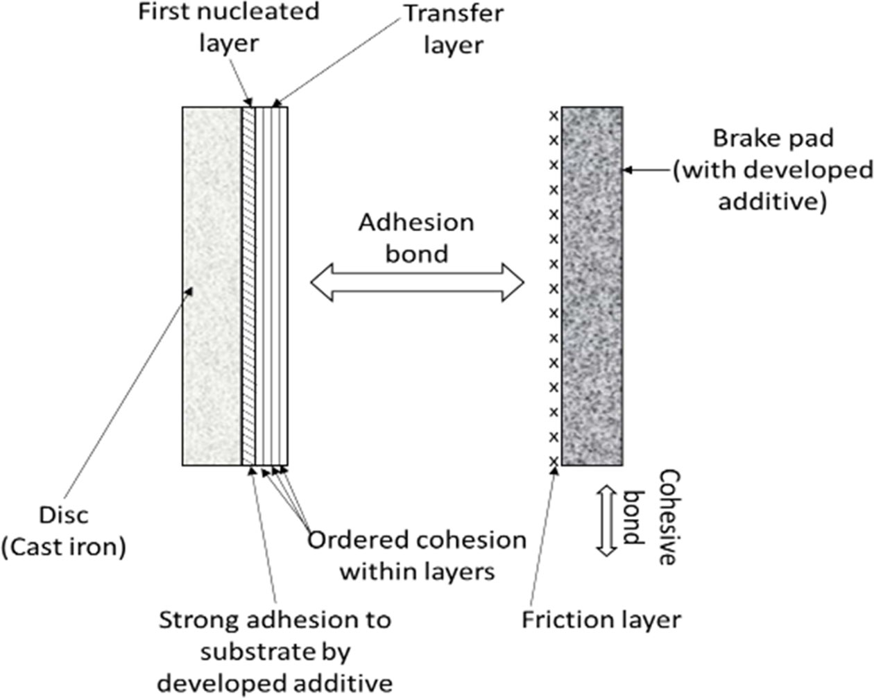 This protective coating called Tribological 3rd body over the mating surface carries an extremely high shear load without fracture or failure. The cohesive bonds within the transfer layer are supposed to be stronger than the adhesive forces between transfer layer and friction layer. But, still, there is a need to maintain high friction. So the transfer layer is removed by stress/fatigue/abrasion and now a new transfer film is formed from the reservoir of the composite, and thus the mechanism of wear occurs [31].